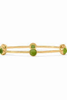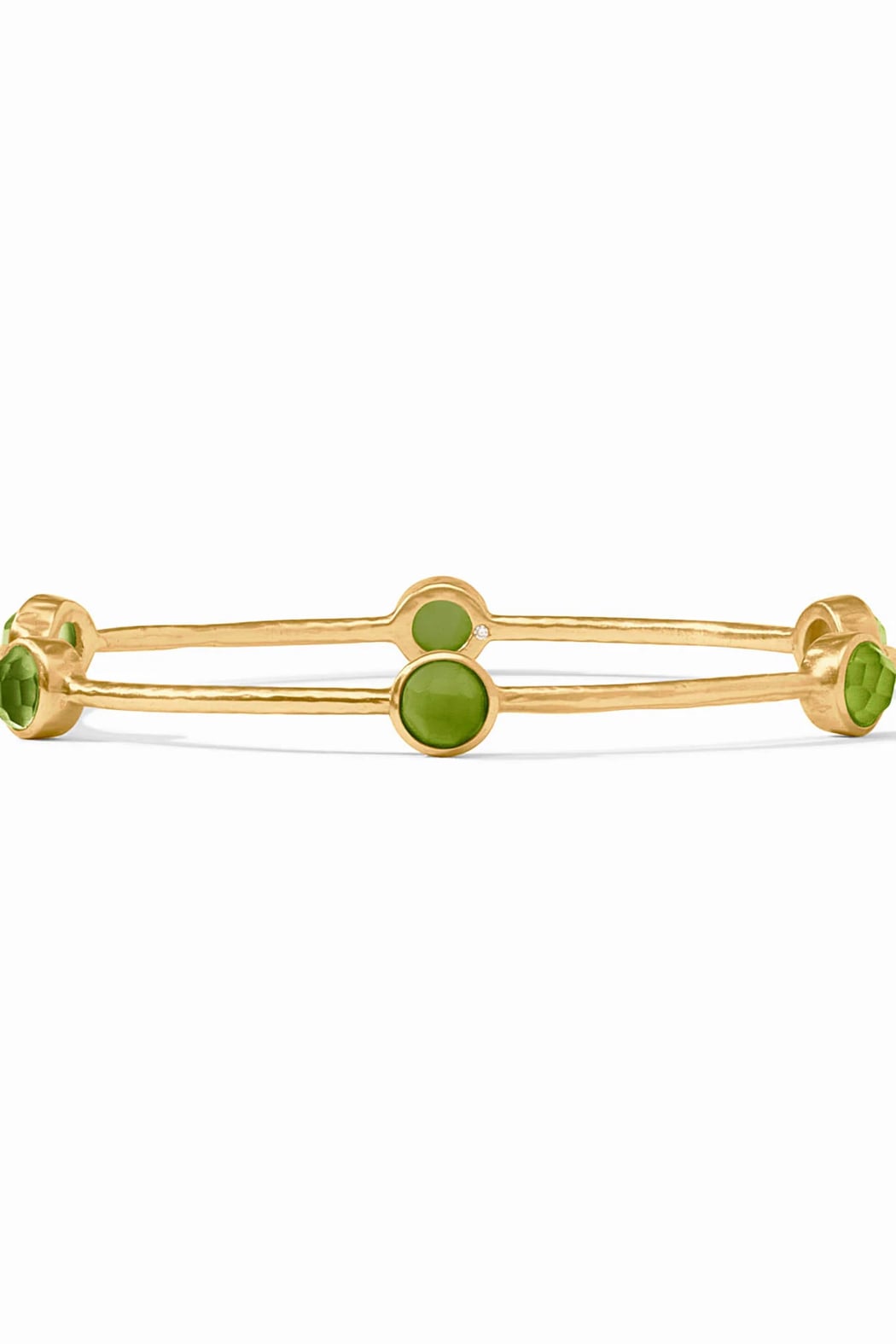 A lightly hammered bangle embellished with six iridescent gemstones stations - this one is Iridescent Palmetto Green