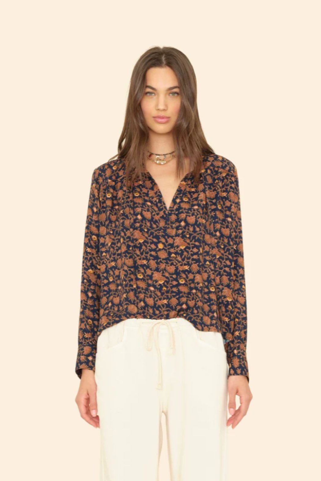 Flower Power. Monika is new this season in our enchanting floral printed rayon. This femme blouse features a split neck with self-tie detail and shirred front and back yokes. Fabric: Jessamine Floral Printed Rayon | 100% Rayon Care: Machine wash cold, gentle cycle, tumble dry low Fit: True to size Model is 5'10" and wears size Small Designed in Los Angeles Style Number: X5PRA001