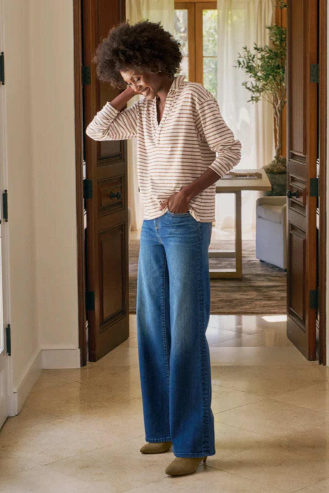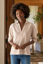 Patrick is Frank & Eileen's best-selling preppy tee to pop on and go. Designed for a slightly cropped relaxed fit. Fits true to size Heritage Jersey, 100% Cotton Description Our runaway hit Popover Henley has a slight drop sleeve, sporty v-neck, and straight raw-cut hem that looks cropped without sacrificing any length or coverage. This piece takes you from running laps to lunch, from beach walks to brunch... Slightly cropped hand-cut raw hem and edges Collared V neckline Long sleeves his durable, open-end yarn is lightweight, breathable, and feels like your favorite vintage tee. 100% Cotton, made in the U.S. from seed to finish. Cotton is grown in the Delta region, spun into yarn in North Carolina, then knitted and crafted into garments in LA. We recommend washing separately in cold water before the first wear to prevent any color transfer. After that, machine wash cold with like colors and tumble dry low.