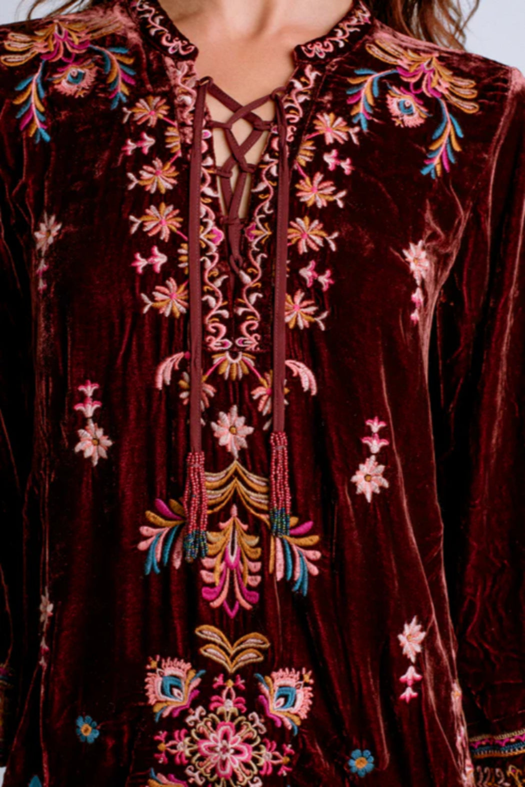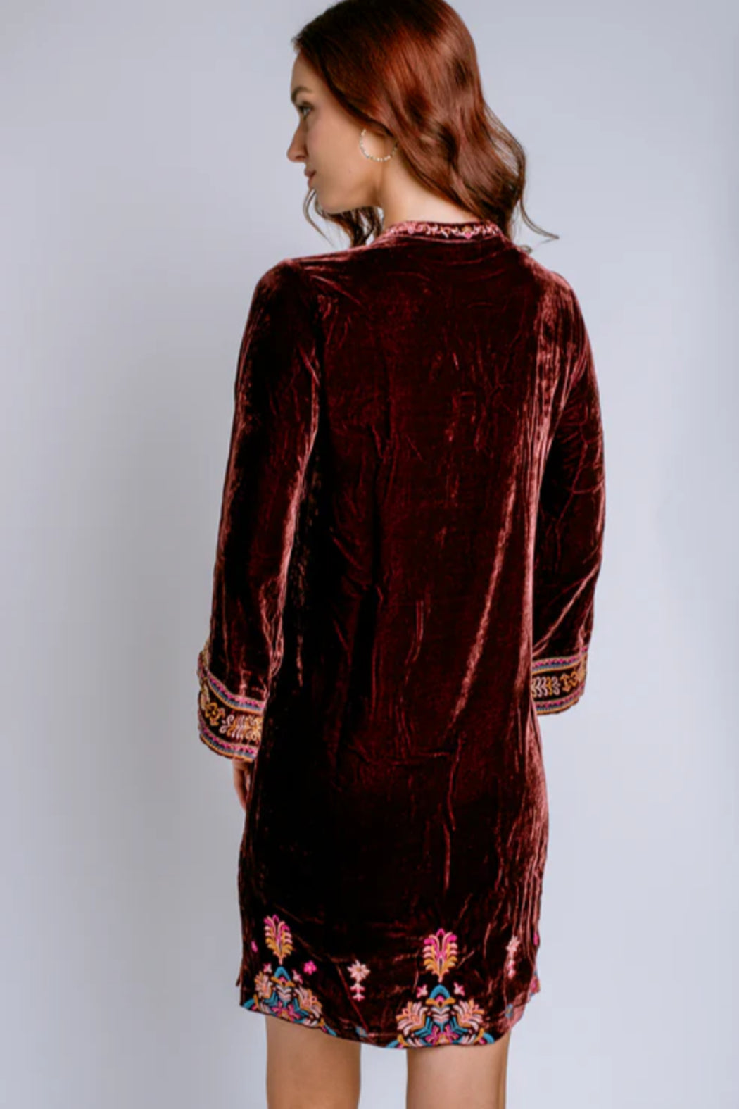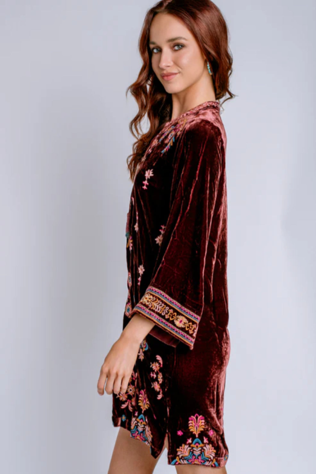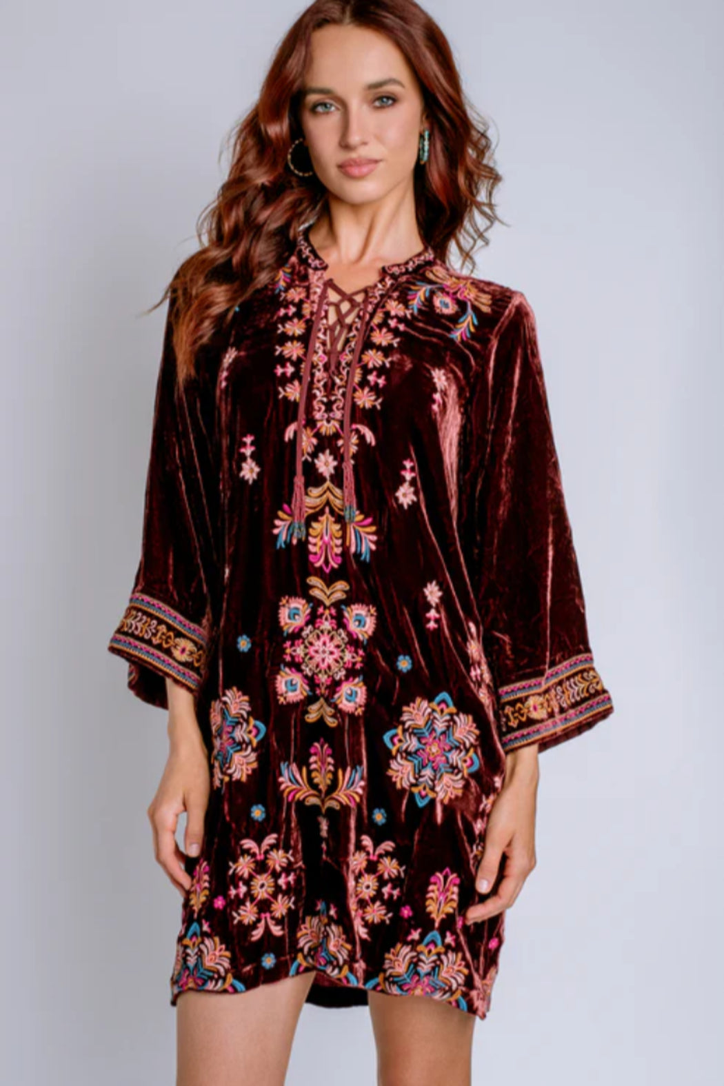 Crafted from a unique silk blend, the Brandi Velvet Tie Front Kimono Dress expertly blends comfort and elevated style. Designed with a split V-neckline with a beaded tassel tie, this dress is finished with wide kimono sleeves and intricate embroidered detailing in vibrant colors. Pair with wedge heels and bold jewelry for a resort-inspired ensemble. 82% Rayon 18% Silk Dry clean only. 43" Bust (size M) 36.5" Length Model: 510" | US 2 | Waist: 25" | Wearing: XS