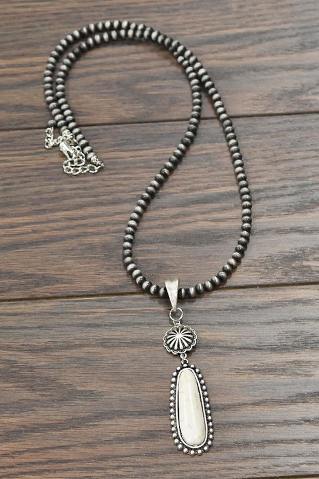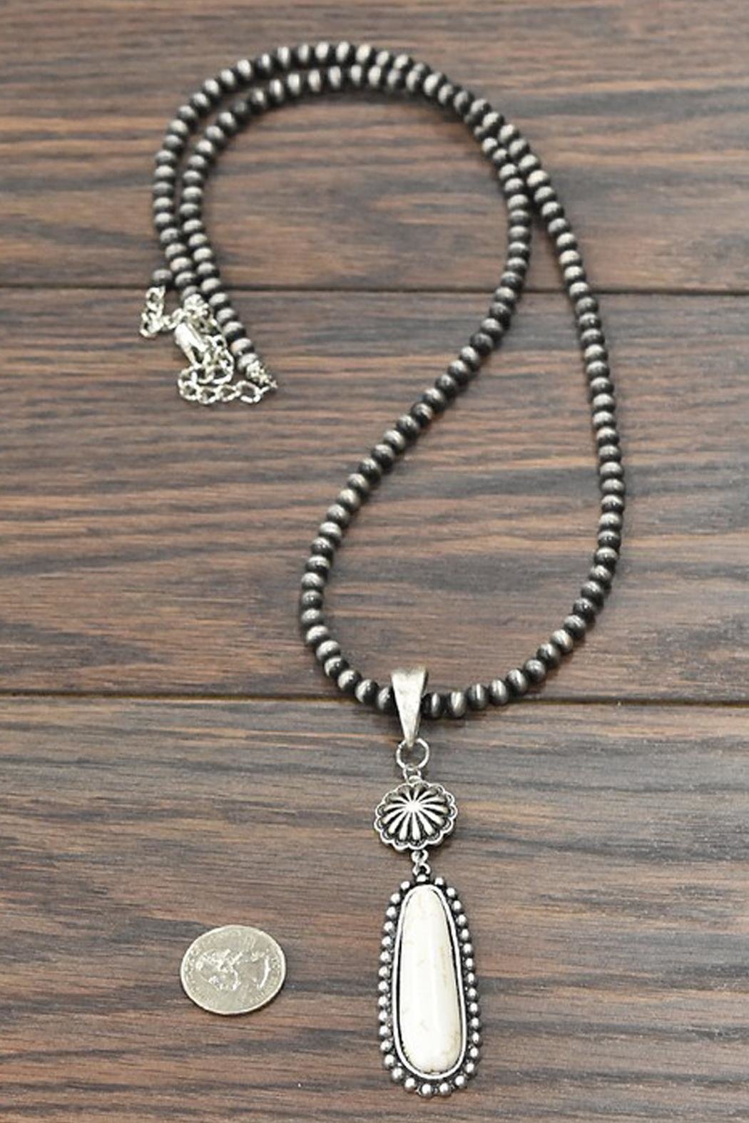 Natural White Turquoise Necklace * Natural stone may vary in size, color or shape * 30" long necklace & 5" extender * 0.25" (6mm) navajo pearl necklace * 3.5" long pendant * 45 grams weight * Alloy metal * Antique silver plate * Nickel, Lead & Chrome free