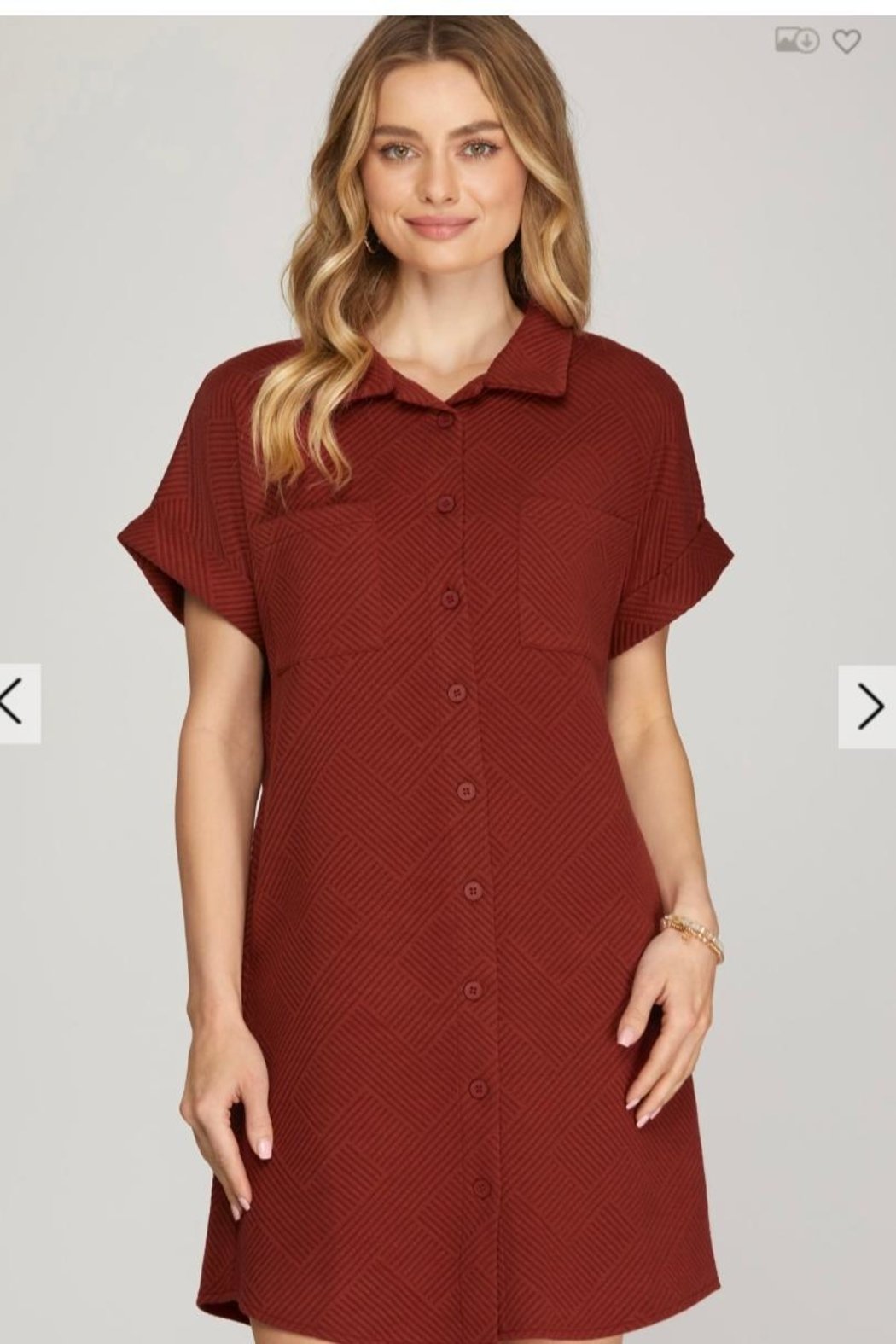 Button down dress in burgundy wine, textured knit chevron pattern, shirt collar, short rolled cuff sleeves, chest pockets, black pleat detail and side pockets. Polyester spandex blend, non-sheer.
