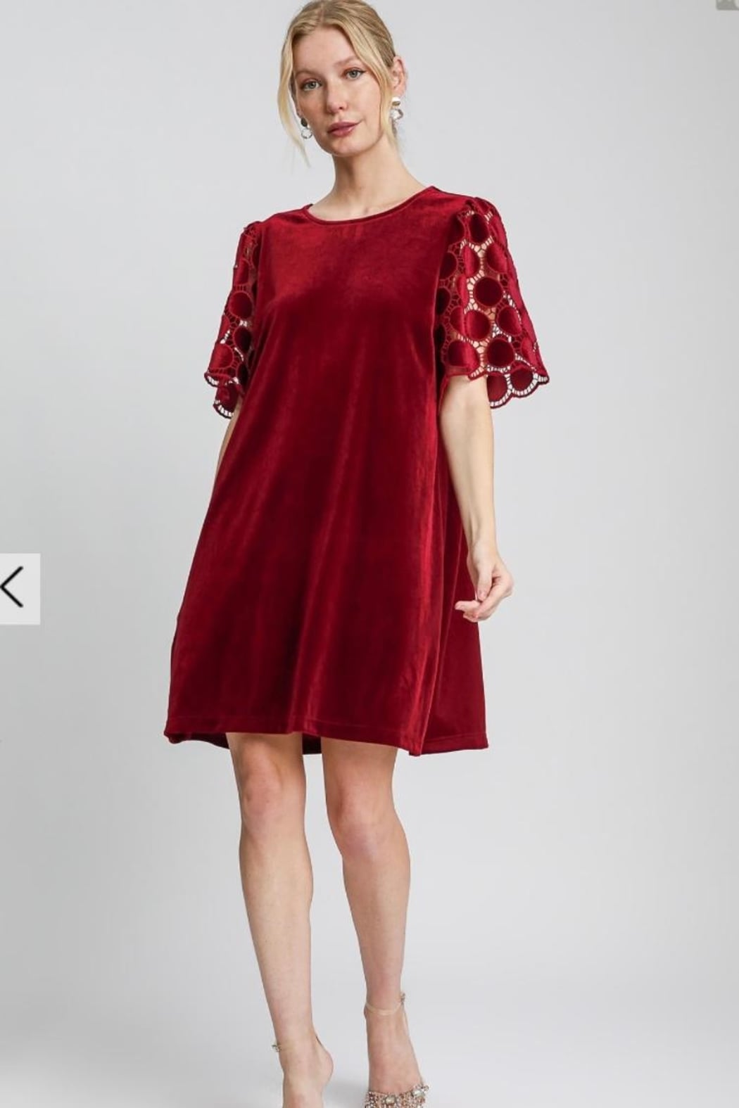 Pullover shift dress in wine color velvet, rounded neckline, short dotted velvet lace sleeves, back button keyhole closure. Soft polyester spandex blend, non-sheer.