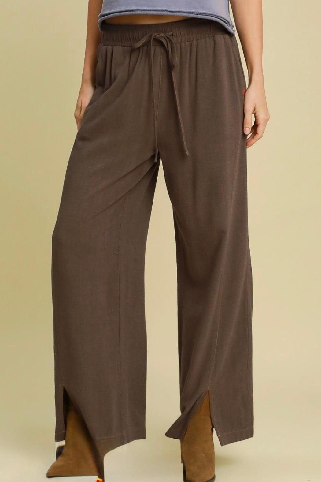 Wide leg pants in mineral washed espresso brown, elastic drawstring waist, side pockets with red embroidered heart detail on right side, pant legs have contrast stitched seam detail with split at hem. Linen cotton blend, non-sheer.