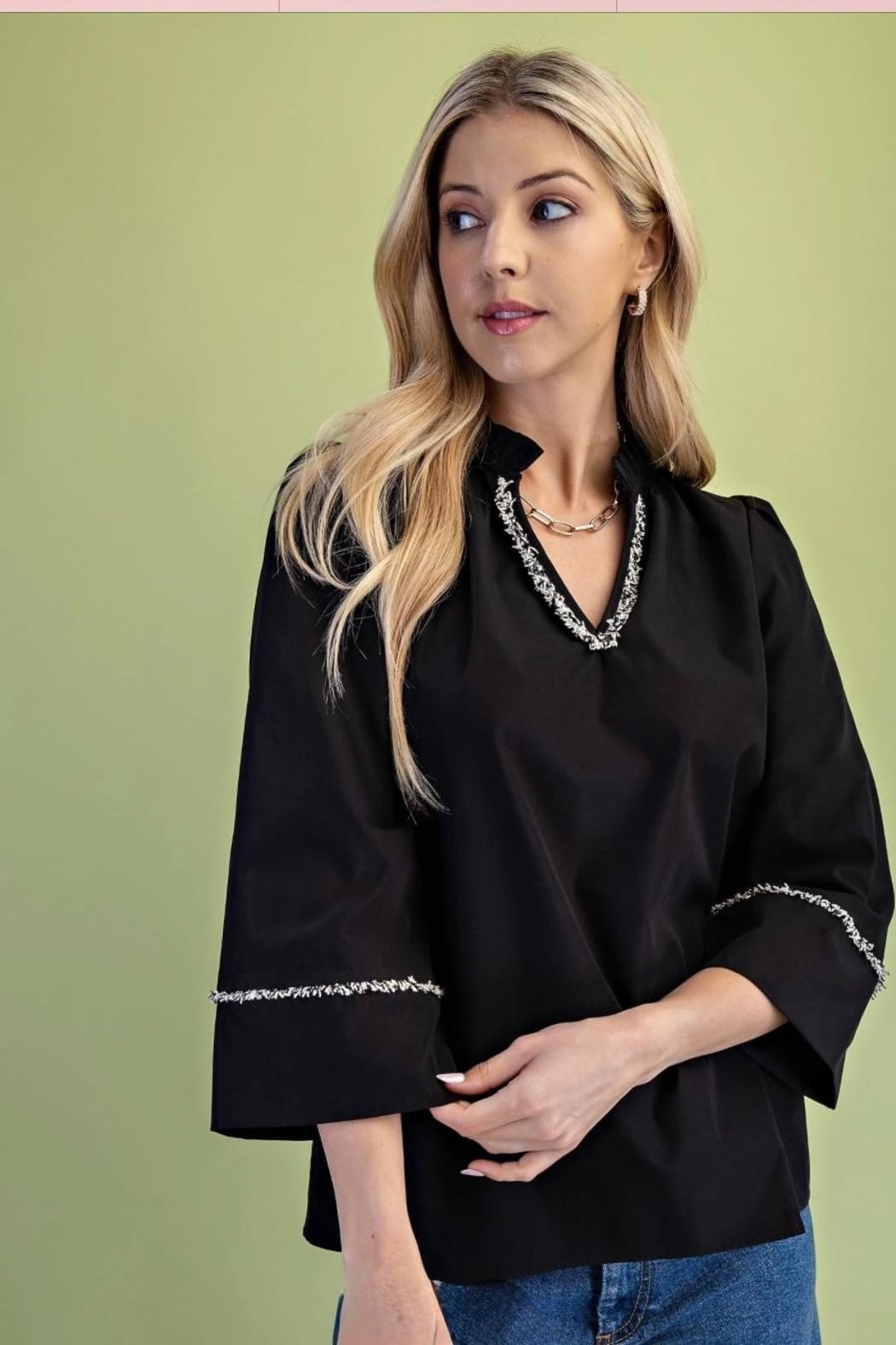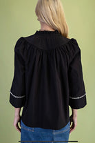Pullover top in black, ruffle neckline with fringe trim, v-neck, 3/4 length wide sleeves with fringe trim, back has rounded yoke with gathered detail. Lightweight polyester, non-sheer.