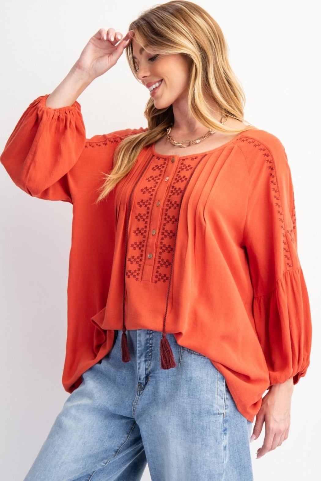 Pullover top in rust, rounded neckline with 3/4 button closure and tassel tie, dropped shoulders with 3/4 bubble sleeves gathered to elastic cuff, pintuck yoke detail, embroidered detail on front and sleeves, loose fit intended. Lightweight rayon linen blend, non-sheer.