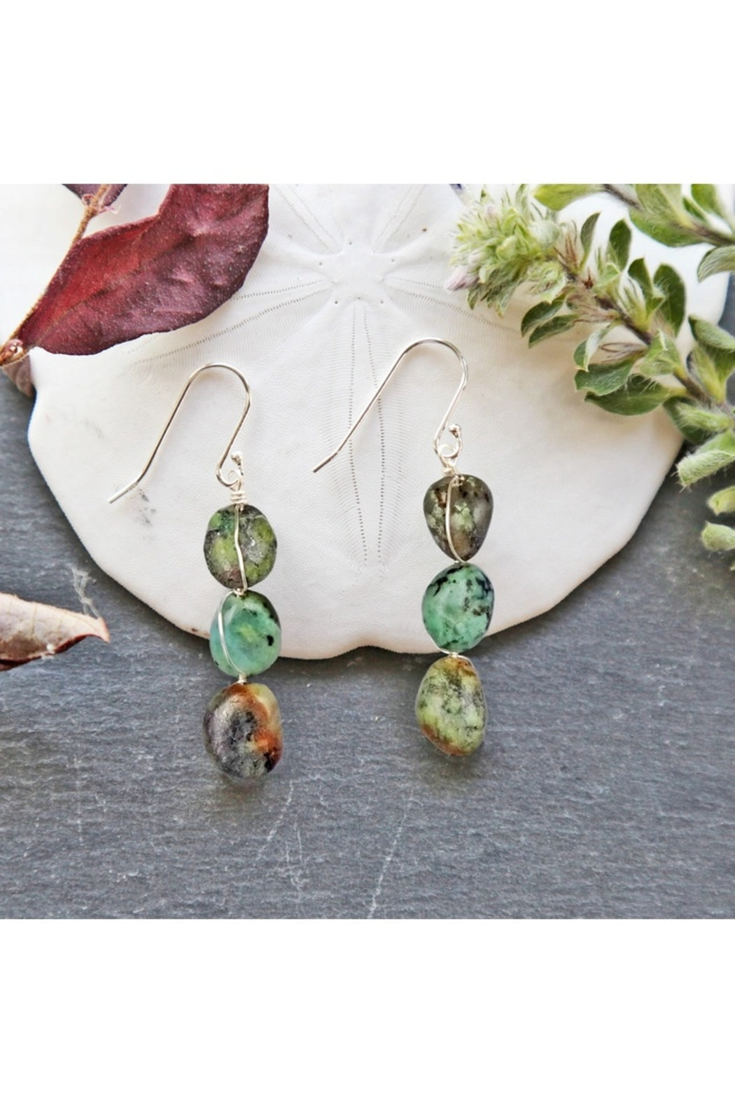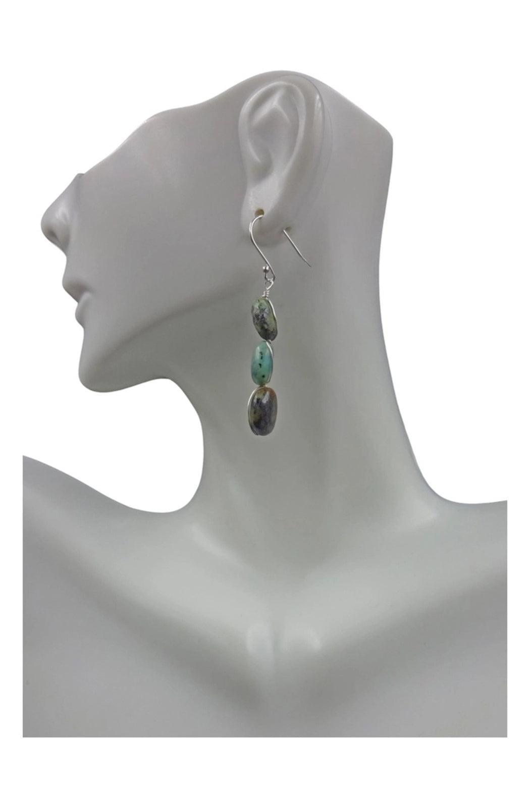African Turquoise Drop Earring. Elevate your look with the natural elegance of these handcrafted African Turquoise Drop Earrings. Featuring three genuine African turquoise nuggets, each stone carries unique green, teal, and earthy brown patterns that make every pair one-of-a-kind. The lightweight yet striking design adds a touch of boho-chic style, perfect for both everyday wear and special occasions. Drop Length: 2" Stone: Genuine African turquoise nuggets Hook: 925 Sterling silver Origin: Made in China Weight: 1.12 oz (31.75 g) Versatile accessory that pairs effortlessly with casual outfits or dressy ensembles, making it a must-have addition to any jewelry collection.