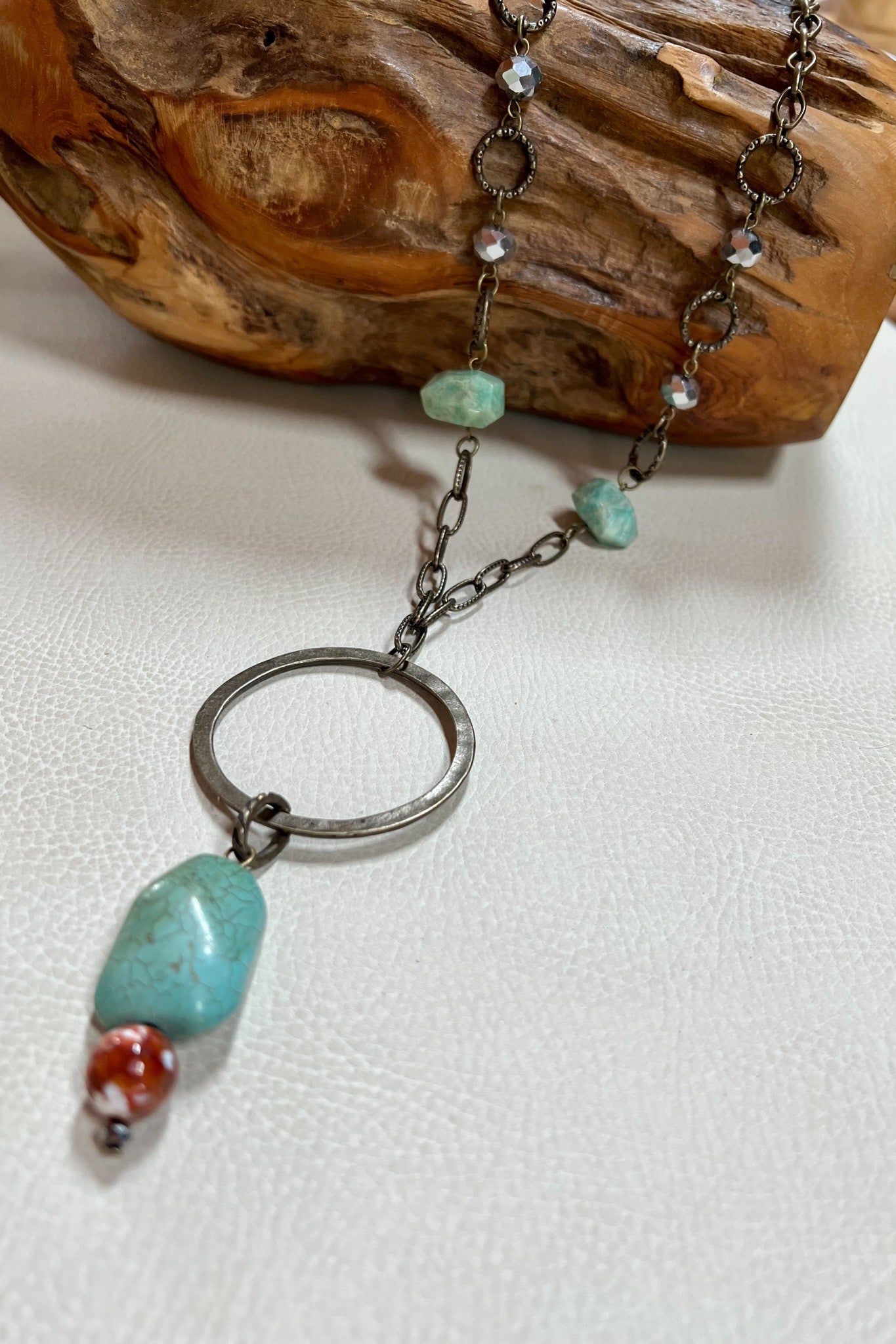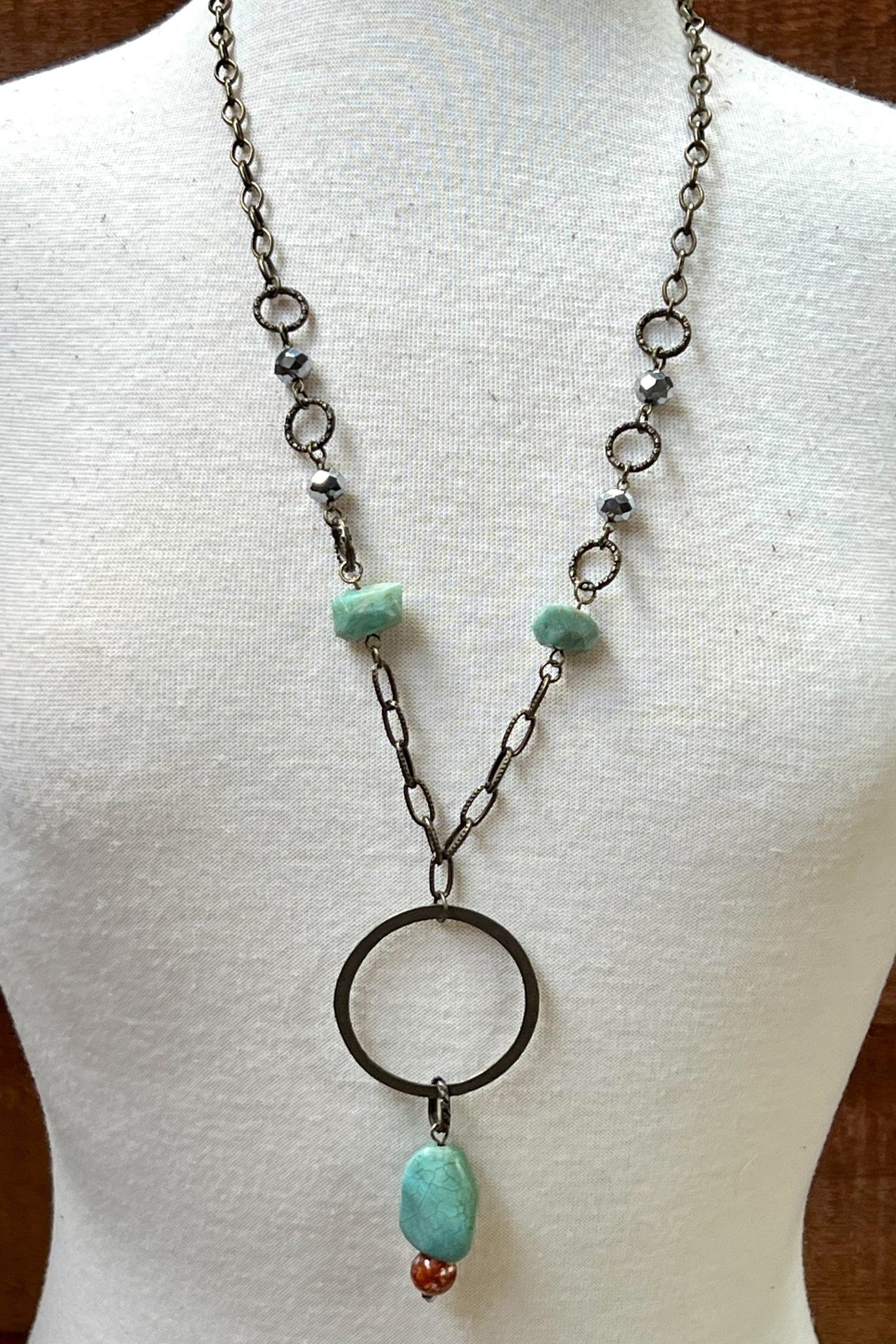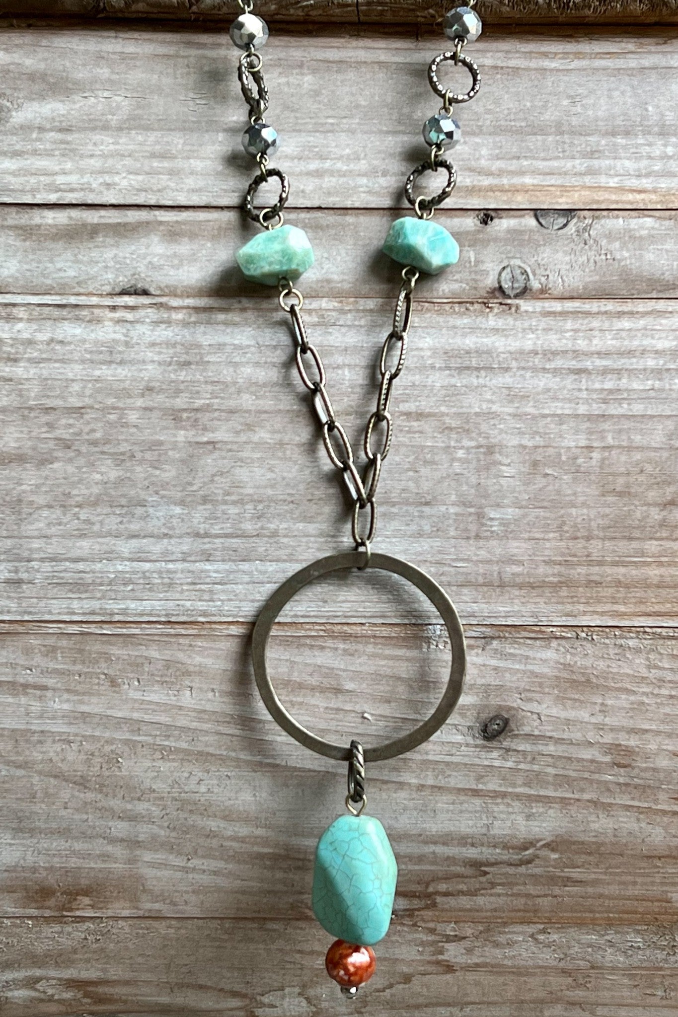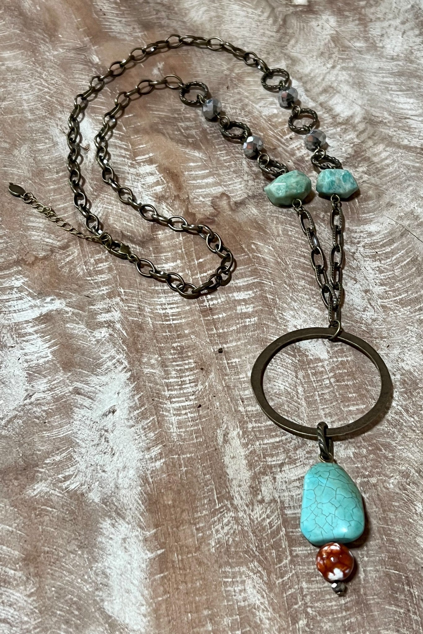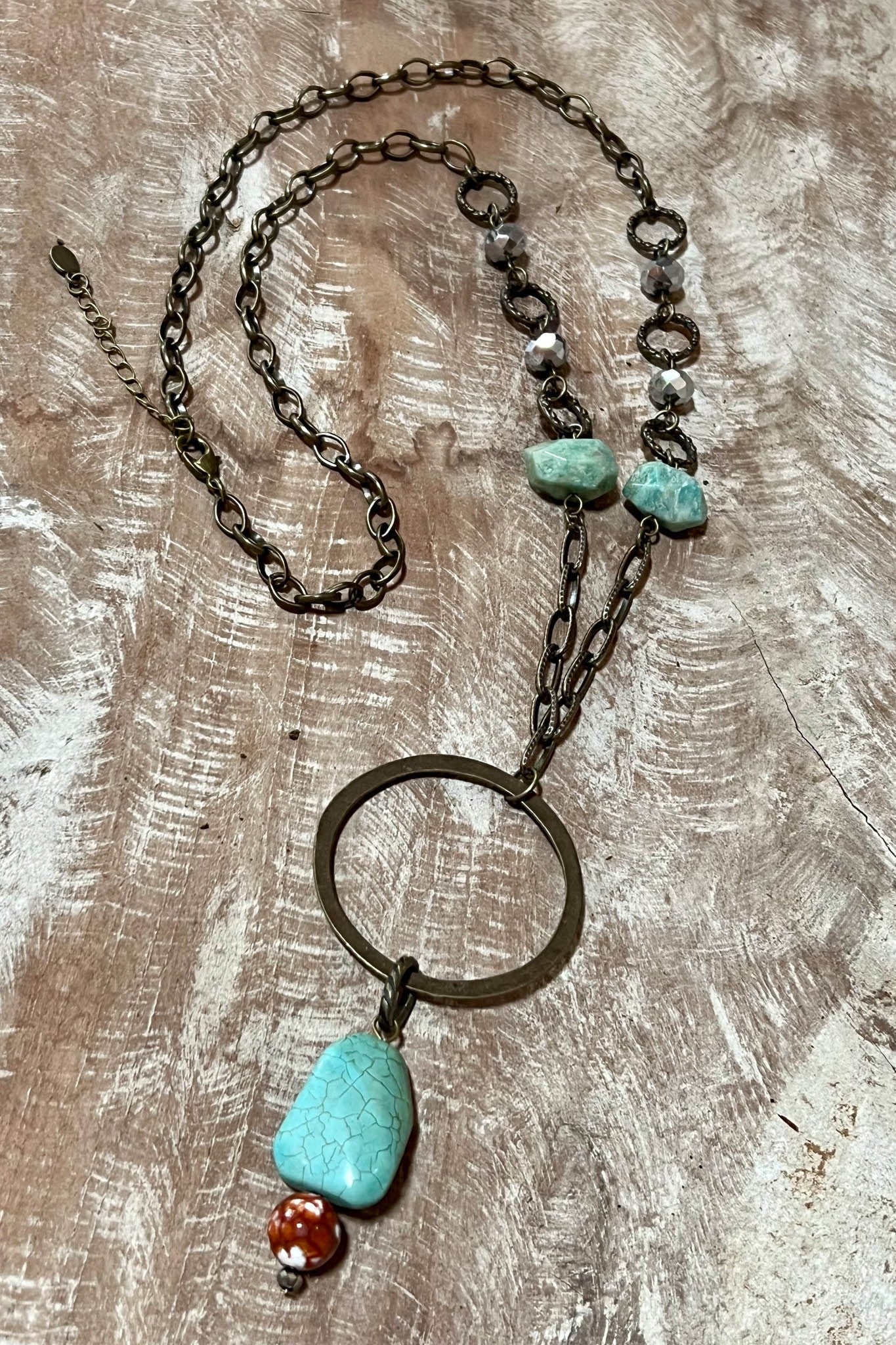 Bronze, chain link necklace amazonite stone beads and a hoop pendant with a turquoise stone. Includes a lobster claw closure and 2" extension. Length (when closed on shortest link): 15". Pendant: 4"