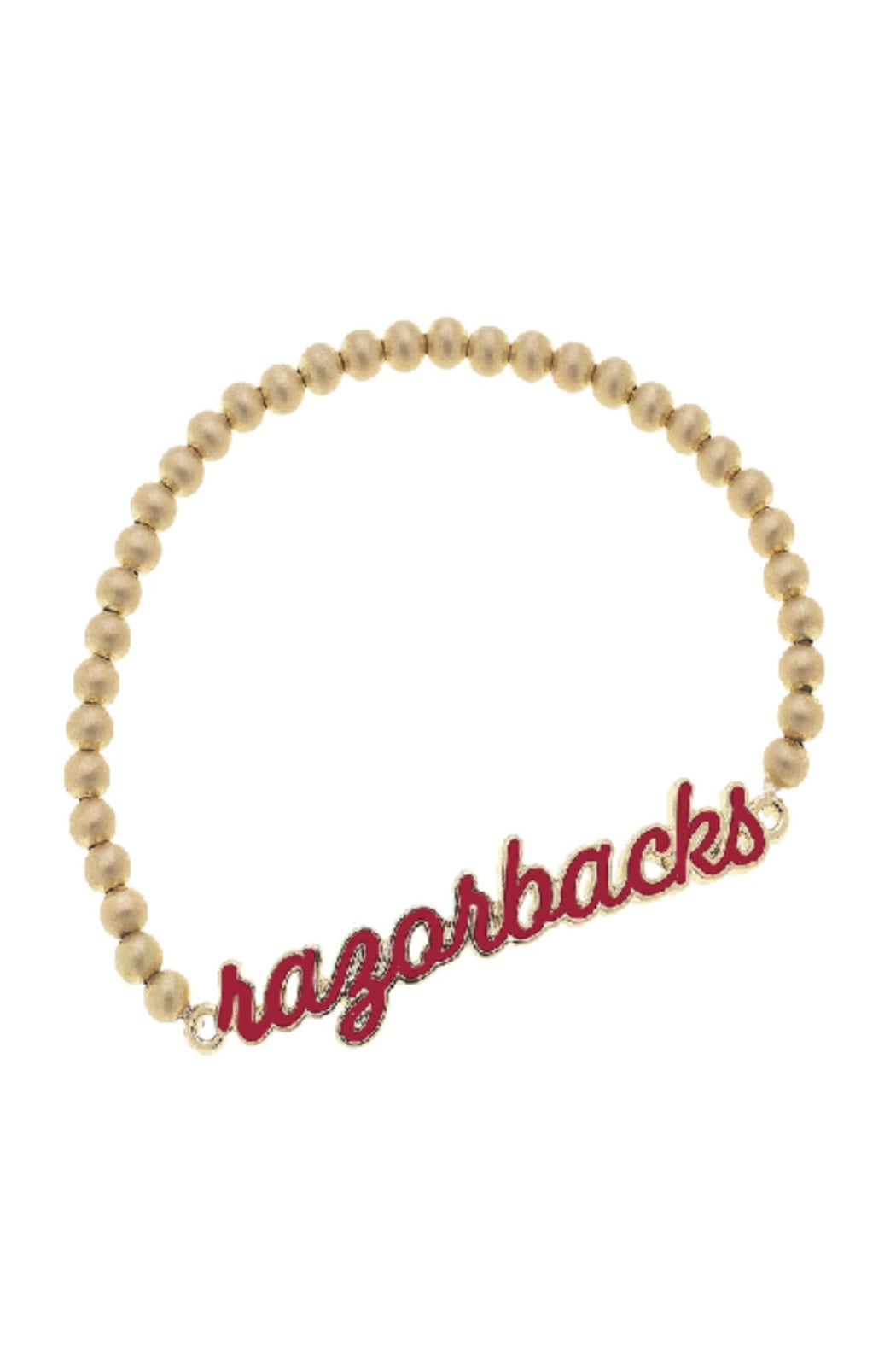 Cheer on your school with this versatile Arkansas Razorbacks Enamel Script Stretch Bracelet in Cardinal & Satin Gold! Perfect for game day, it can be stacked with other bracelets or worn alone. Show your team spirit with "razorbacks" pride (and style)!