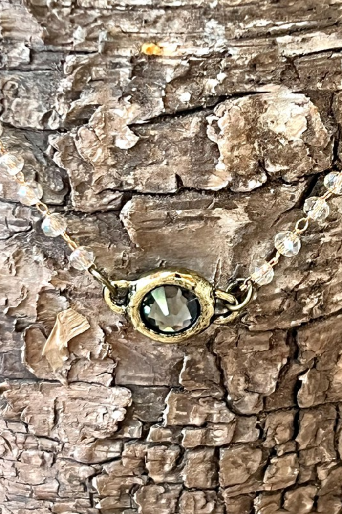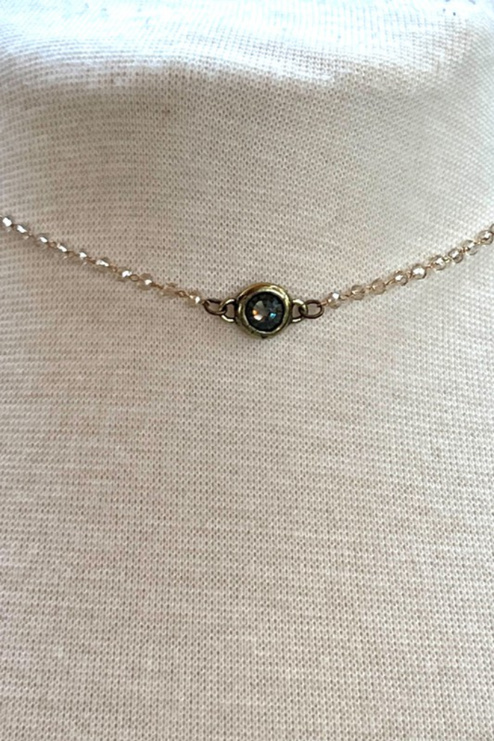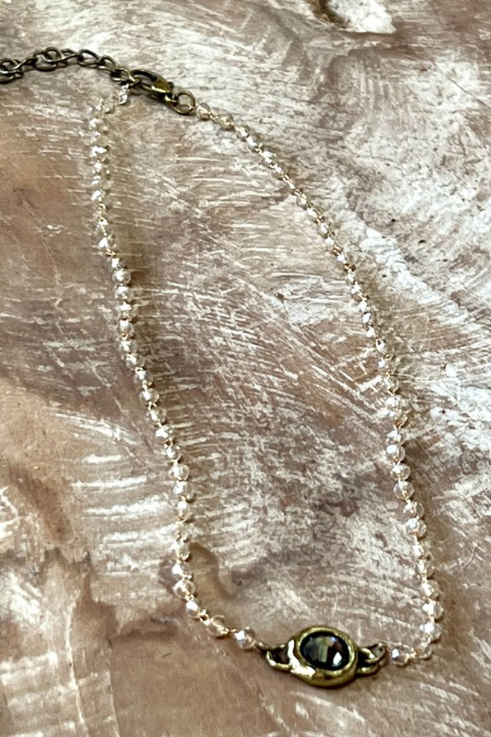 Dainty crystal beaded necklace with small crystal pendant. Fits as a choker necklace. Has a lobster claw clasp and a 2" extender. Length (when clasped on the shortest link): 6"