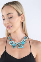 This floral statement necklace features a beautiful blue coloration on an alloy chain. This statement necklace is the perfect summertime piece of jewelry and can be worn on any occasion!  Product Details: * Gold and blue alloy * Length: 12" + 2" ext. * Clasp: lobster * Also available in other colors