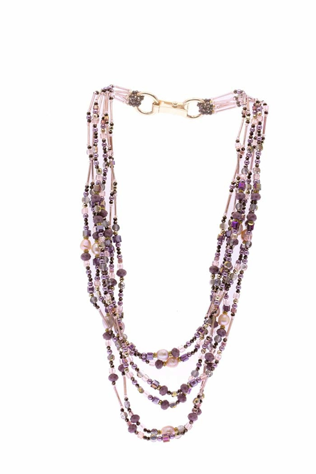 Amethyst Dreams Glass Beaded Crystal Layered Necklace. "Pair the Amethyst Dreams Necklace with a sundress and head out into the town. This layered necklace features beautiful strands of glistening glass beads in tones of purplish lavender and black, paired with freshwater pearls. Wear this around your neck and be uniquely beautiful! Glass Beads, Freshwater Pearl, Crystal Stone, Brass Charm Size: 24" Long Hinged Snap Closure" Details SKU: 614669 Made in India Dimensions: 24 in (61 cm)