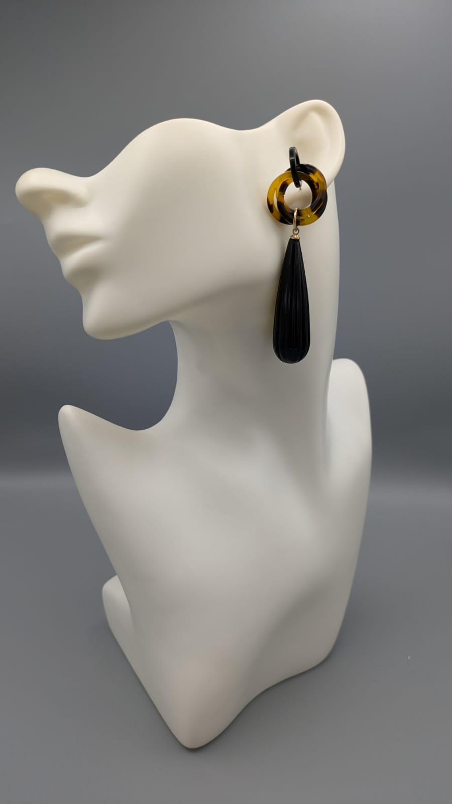 These exquisite Fifi Earrings feature a unique tear drop design with a blend of black and tortoise shell accents. Perfect for adding a touch of elegance and sophistication to any ensemble. Elevate your style with these exclusive earrings.