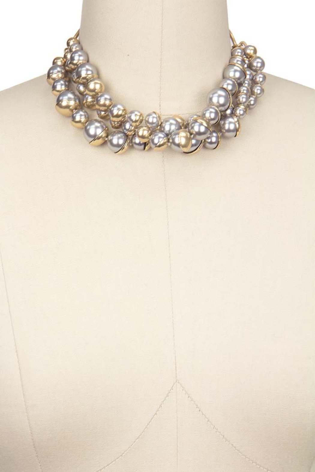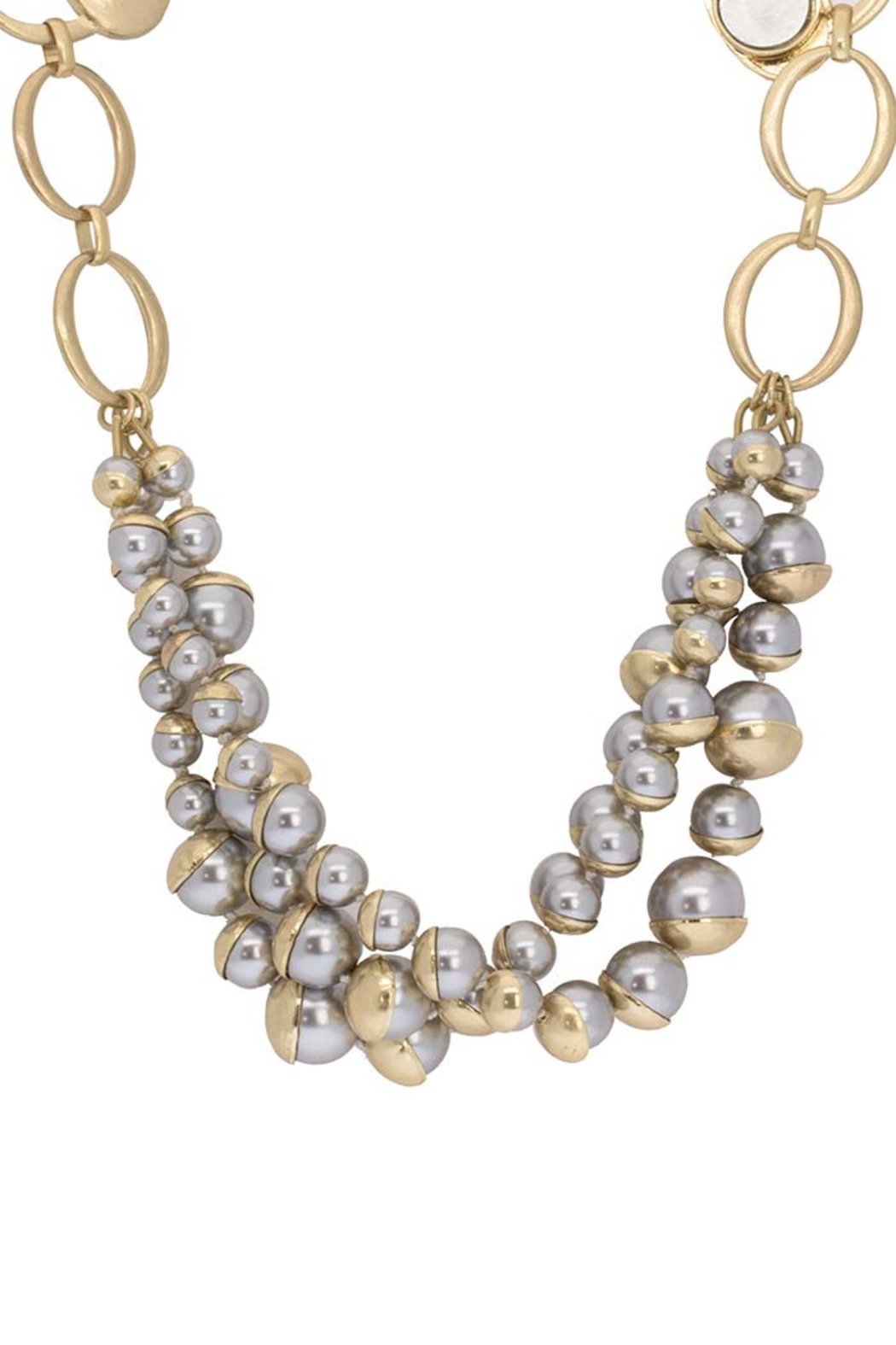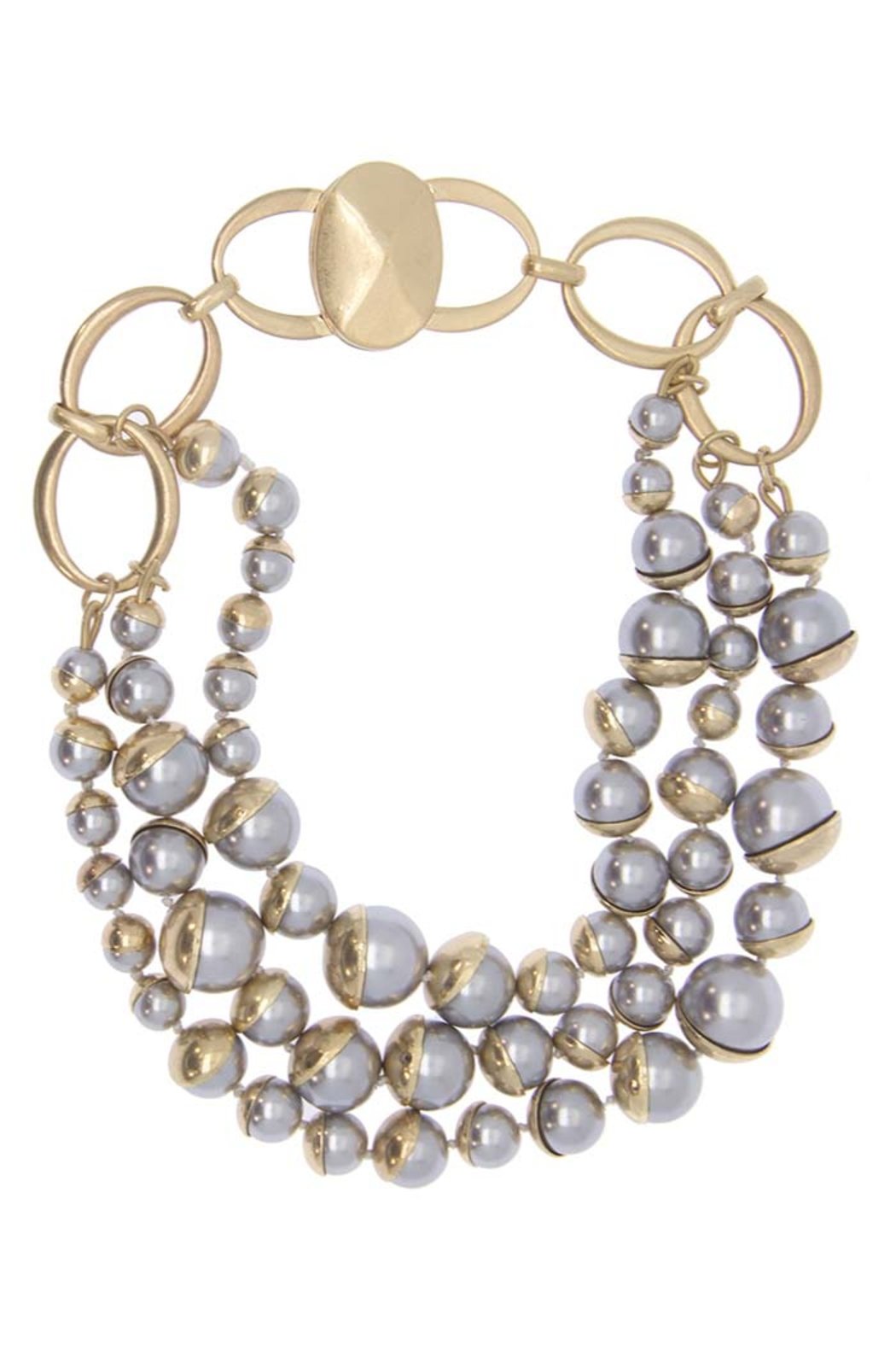 "Ever-so-classic with modern, gold detail, our Half Moon Pearl Statement Necklace features three strands of pearls of multiple sizes, half plated in gold. Wear it alone, or pair this ethereal necklace with the coordinating Half Moon Pearl Bracelet and Earring. A magnetic closure makes for easy on/off. Available in two neutral colorways.
