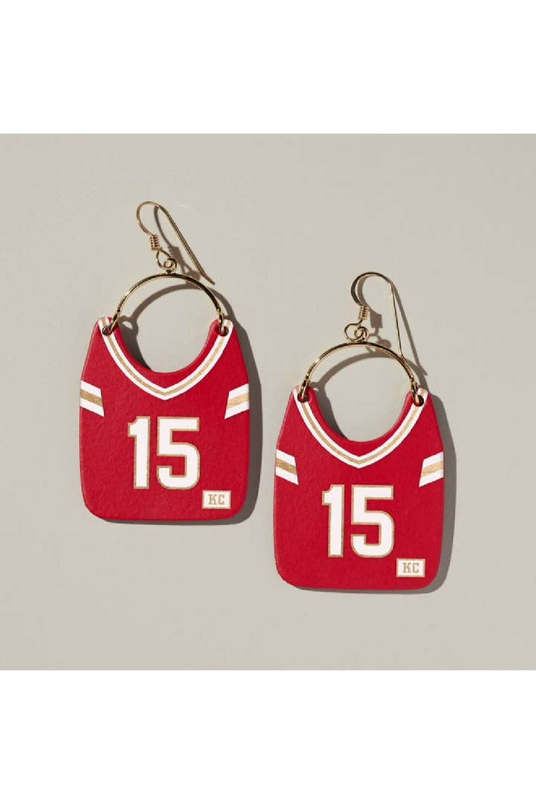 Elevate your game day look with our Kansas City Jersey #15 Earrings! These one-of-a-kind jersey shaped earrings are designed to honor our hometown team and Kansas City player #15. You'll be the MVP of stadium style when you sport this pair to any tailgate, watch party, or game! Show off your team spirit or gift them to the biggest fan you know. Made from premium Italian leather- these lightweight earrings are hand-embossed in Kansas City by Nickel & Suede. Available in 14k gold-filled ear wire or rhodium-plated sterling silver ear wire.