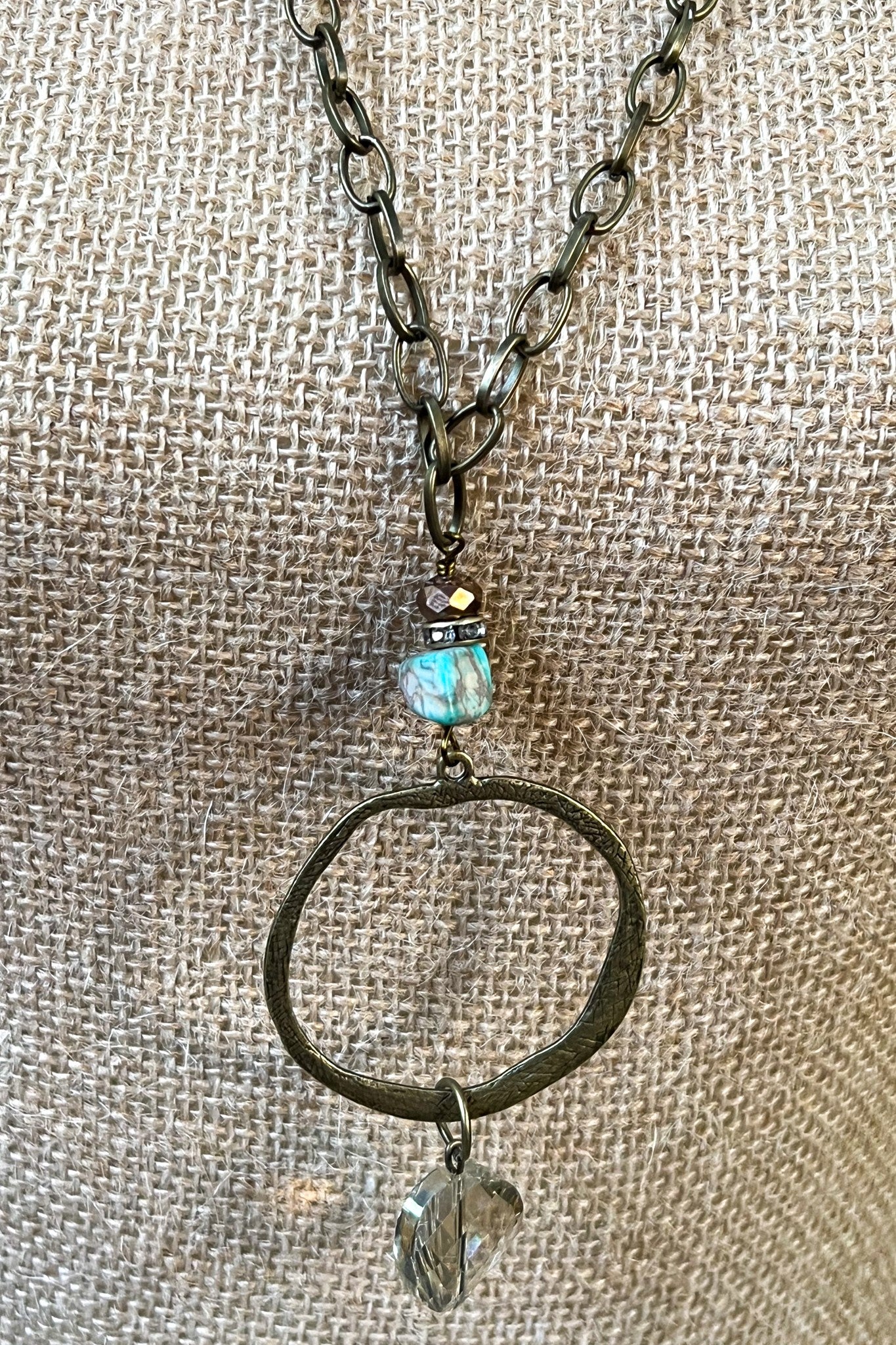 Long chain necklace with adjustable lobster claw closure. The necklace also features a bronze hoop with a crystal charm. Length: 29". Length of Charm: 3.5". Lead free materials. Made in China.