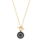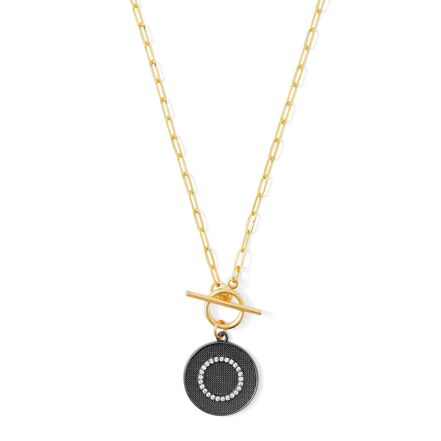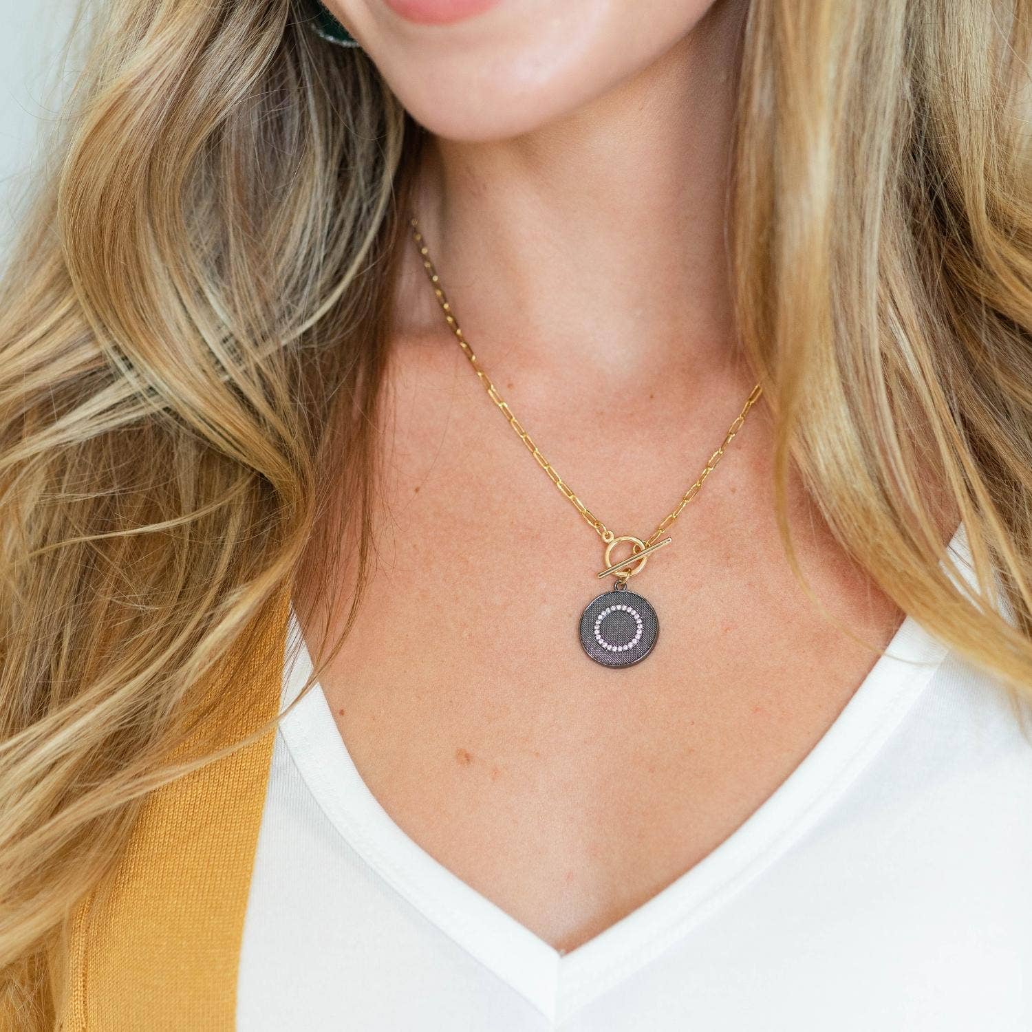 Textured round gunmetal charm with cz accent circle on delicate paperclip chain and toggle closure