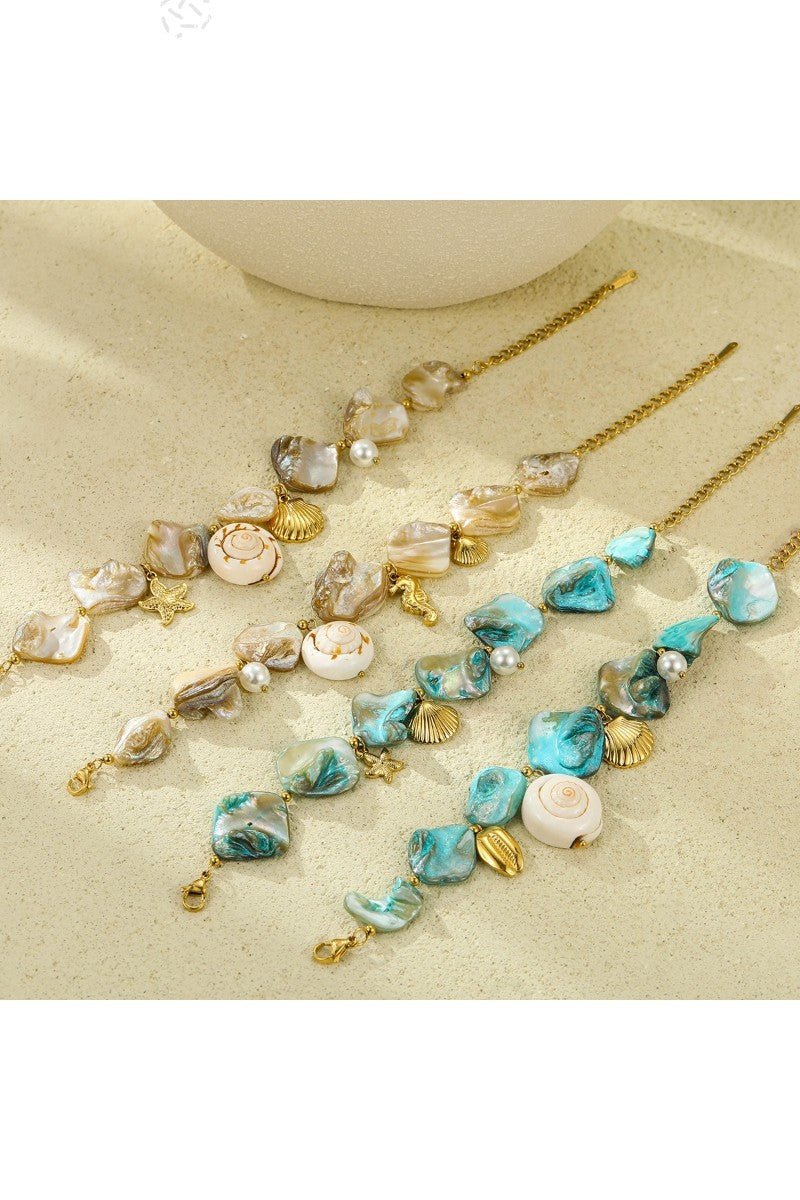 Captivating coastal charm bracelet featuring seahorses and shells with multiple color options. This bohemian-inspired piece combines natural shells, pearls, and sea motifs for the perfect summer accessory. Whether stacked or worn alone, this versatile bracelet brings ocean vibes to any outfit. The gold accents and turquoise details create an irresistible marine-themed statement that embodies carefree coastal style.