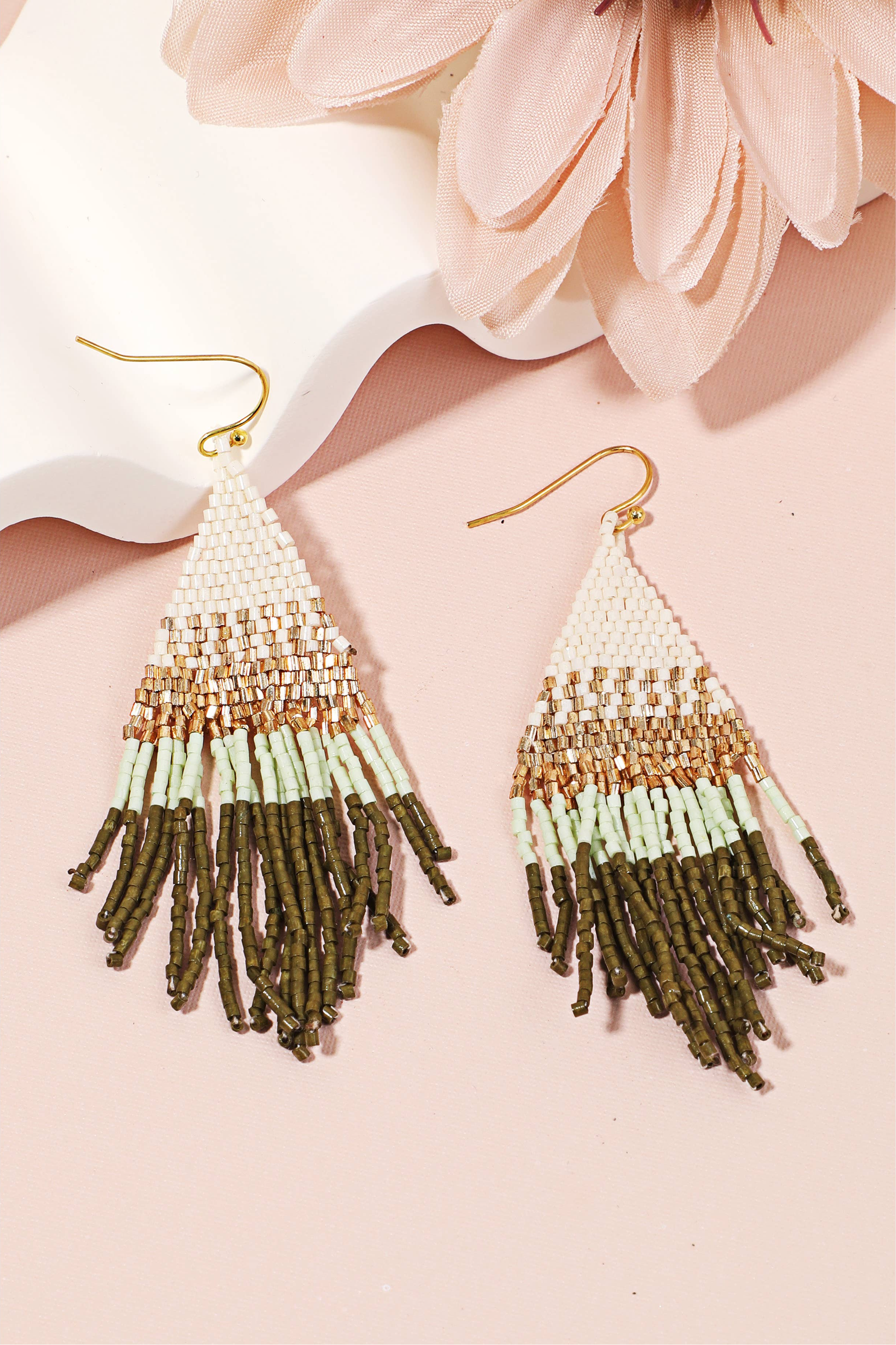 A classic design with a contemporary twist, this pair of earrings shows off a distinctive seed beaded pattern triangle fringe design. Redefine your fashion identity with this versatile accessory, a timeless piece that complements any wardrobe. Available in Gold Brown, Gold Olive. This pair of earrings is made with 99% Glass Seed Beads and 1% Iron Metal. Ships in 1-3 business days