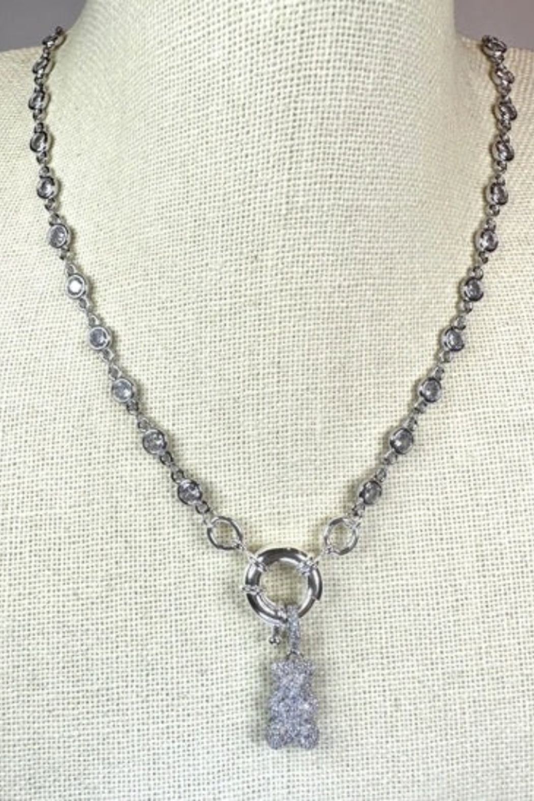 Silver clear Crystals by the yard chain with spring ring and golden teddy bear Approximately 16 inches with 2 1/2 inch extender Chain is silver over brass with clear sparkly crystals with lobster clasp.
