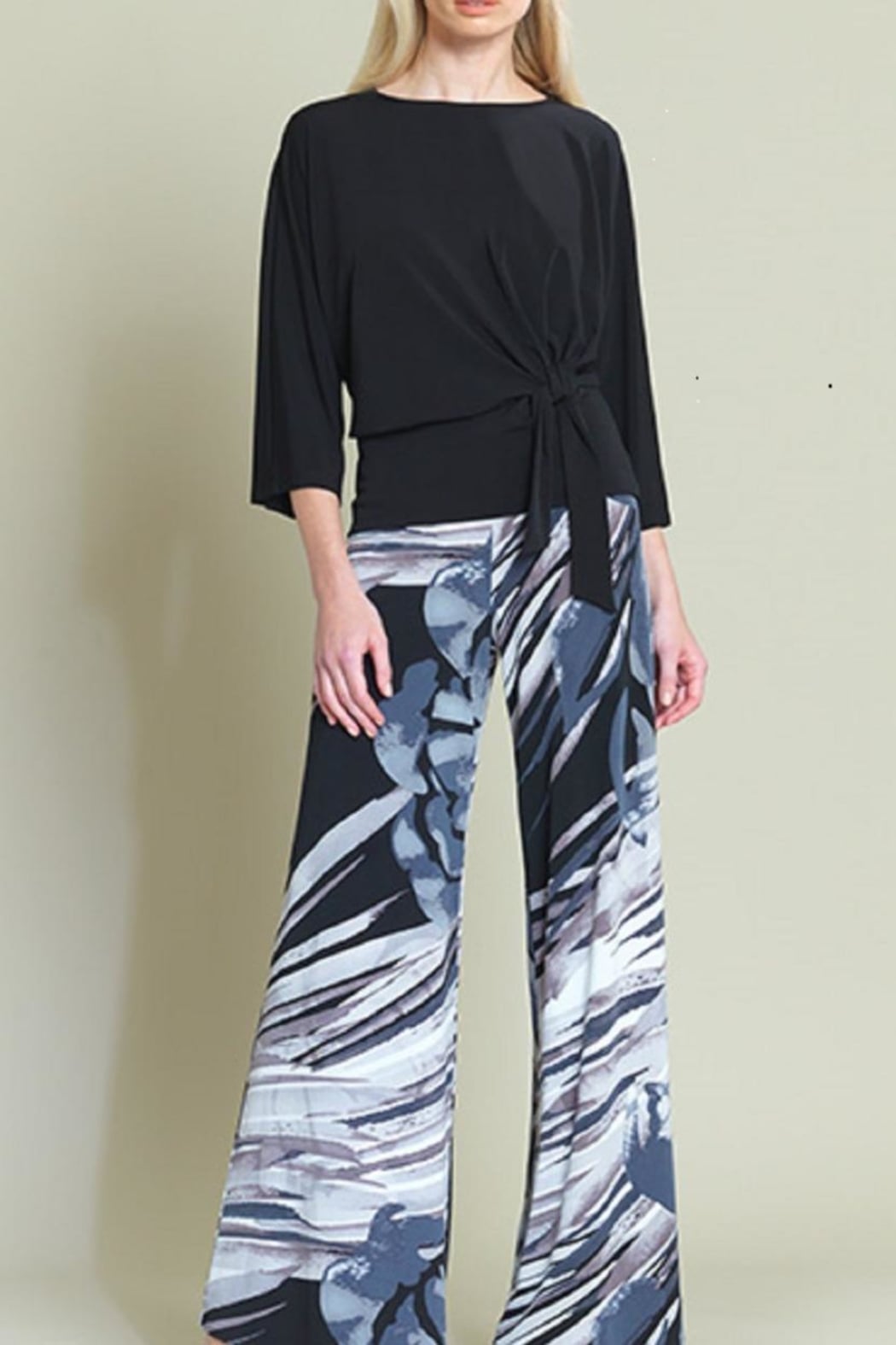 This black Detailed top has a side tie together with a banded waist to the hip. A boat neck with 3/4 loose sleeves creates a classy style. Just pair with a print skirt or pant and you have a great outfit for the office, date night, vacation wear, or just casual.