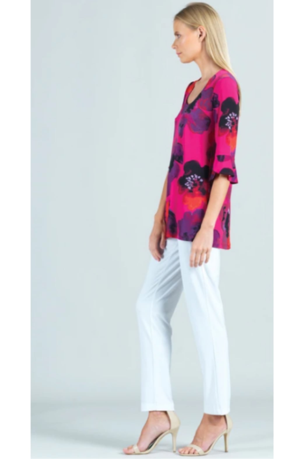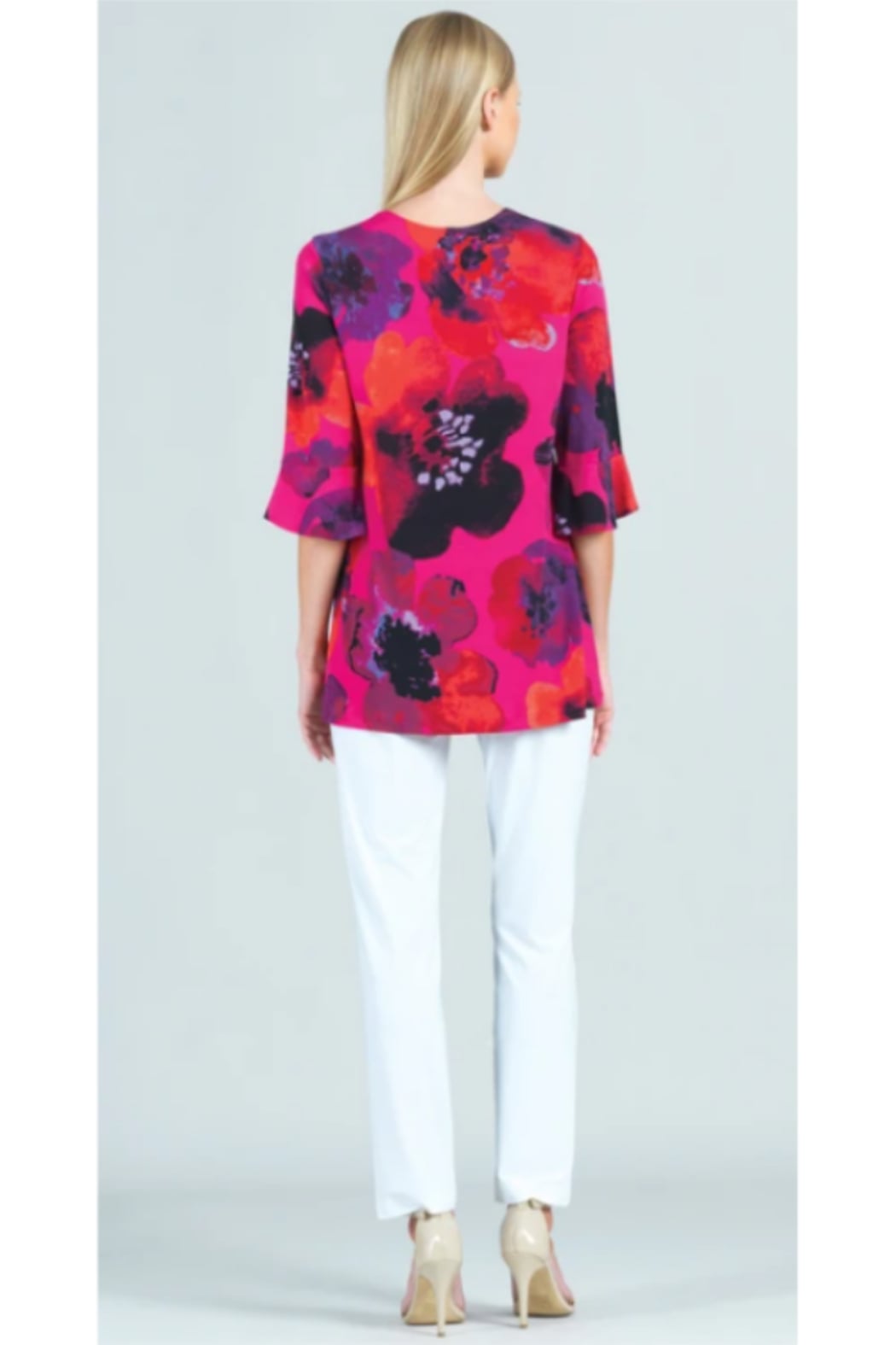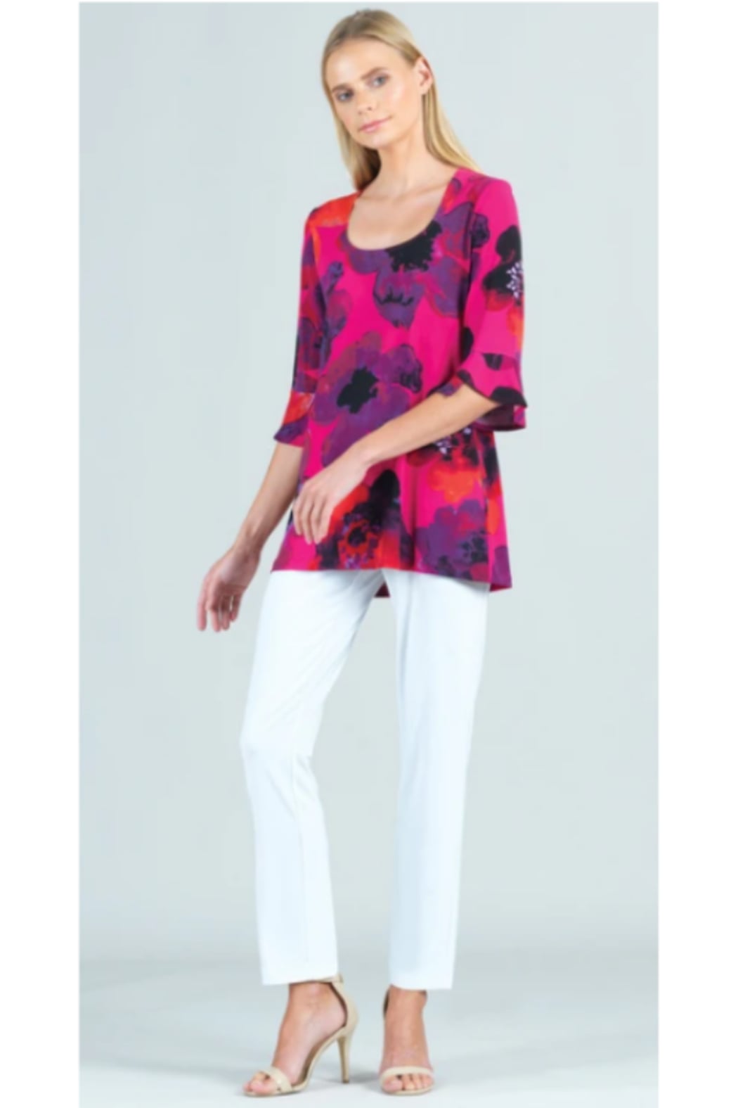 Our Poppy Print U-Neck Tulip Cuff Sleeve Tunic is one you're sure to always remember because it is a silhouette perfectly suited for every woman! Featuring a u-scoop neckline, elbow-length tulip cuffed sleeves, and a beautifully draped, soft flare hemline that accentuates all body figures in the most flattering way. A beautiful poppy flower print comprised of warm shades of warm fuchsia, reds, oranges, and purples with subtle hints of black and lilac. ? Each piece is a unique, one-of-a-kind print and print placement will vary Carefree Travel Fabric - Soft Silky Knit Made from our signature soft stretch poly blend fibers. Easy care, quick-drying, and cooler than linen or cotton. Wrinkle Free Travel Friendly Ultra Lightweight Soft Knit Fabric Breathable Jersey Like Feel Size & Fit Model is 5'9" wearing extra small Designed to fit true to size with a slim straight body cut. Product Details SKU# TU22P1 Color: Fuchsia/Multi Fabric Content: 70% Polyester, 20% Rayon, 10% Spandex Made in the USA and designed in New York