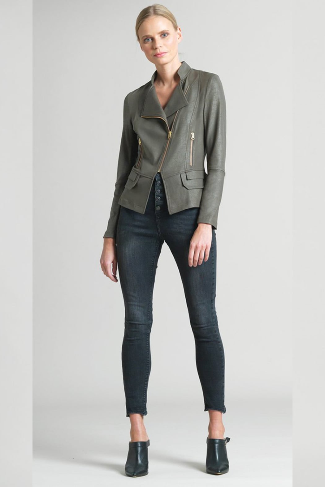 When innovation is combined with edge you'll be sure to see our Liquid Leather Biker Jacket! A unique design which is made from our beautiful signature stretch knit, extremely lightweight soft "lambskin feel" fabric with a soft matte finish. This jacket features a notched lapel with upright collar, long sleeves with upper arm stitching, a rustic gold asymmetrical waist zip-up closure, faux pocket zipper slits and peplum waist seam with structured double tiered flaps, as well as curved and vertical back seams that provide a more shaped and slender silhouette. Our Olive is a darker neutral shade with sage undertones. Inspired by luxury motorcycle jackets, the interior is made from soft knit giving it the right amount of stretch with breathable superb wear that conforms to your body and provides you with the utmost comfort. Liquid Leather Knit Made from our signature soft stretch poly blend fibers with a coating of faux liquid leather matte finish. Easy care, quick drying and cooler than linen or cotton. Travel Friendly Ultra Lightweight Soft Knit Fabric - Faux Leather Matte Finish