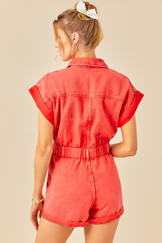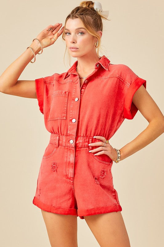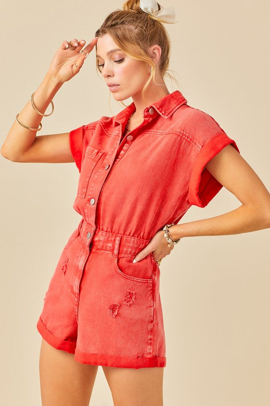 Red Distressed Denim Romper