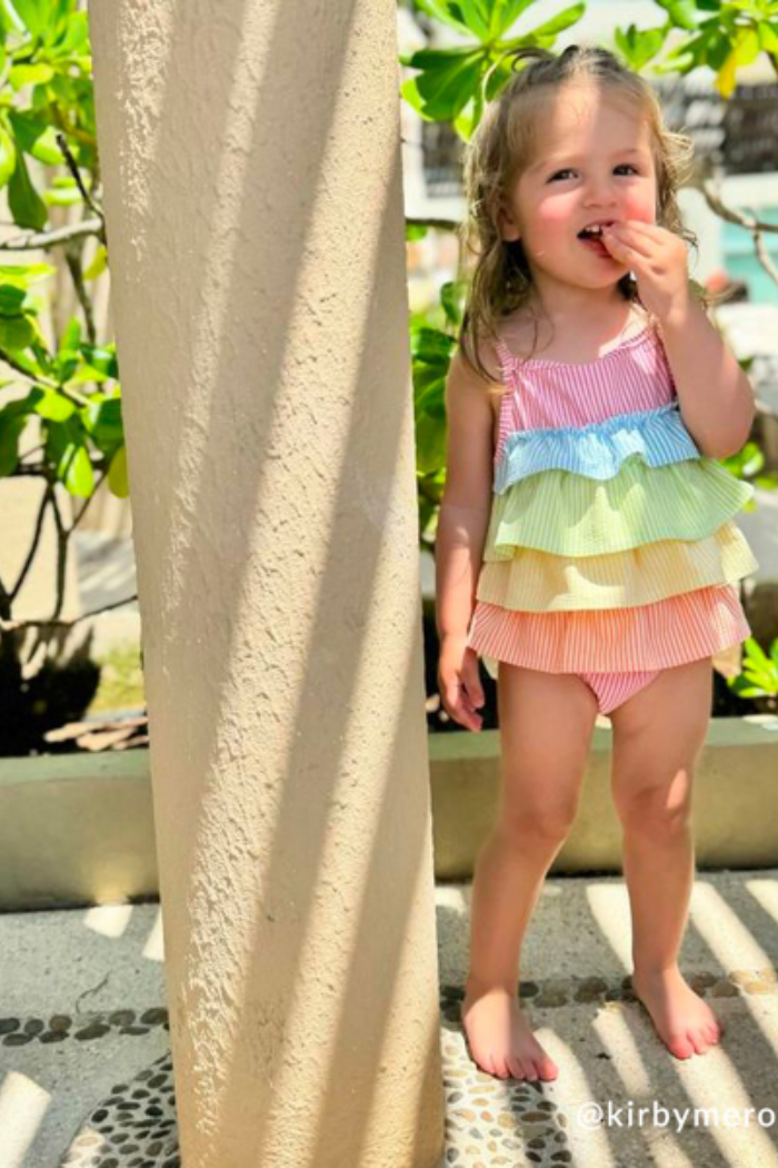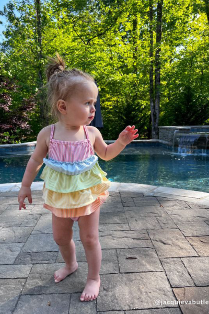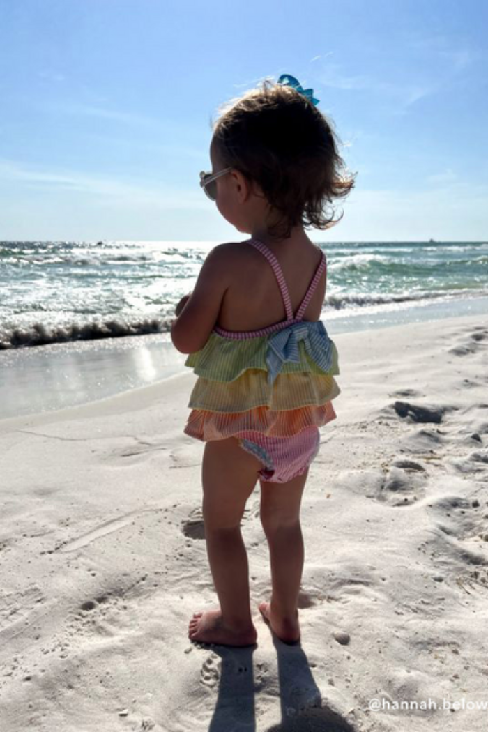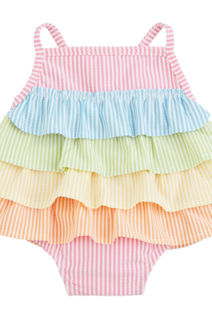 The Seersucker Ruffle Suit is a one piece swimsuit with a ruffle design, UPFS 50+ sun protection with snap closure underneath.