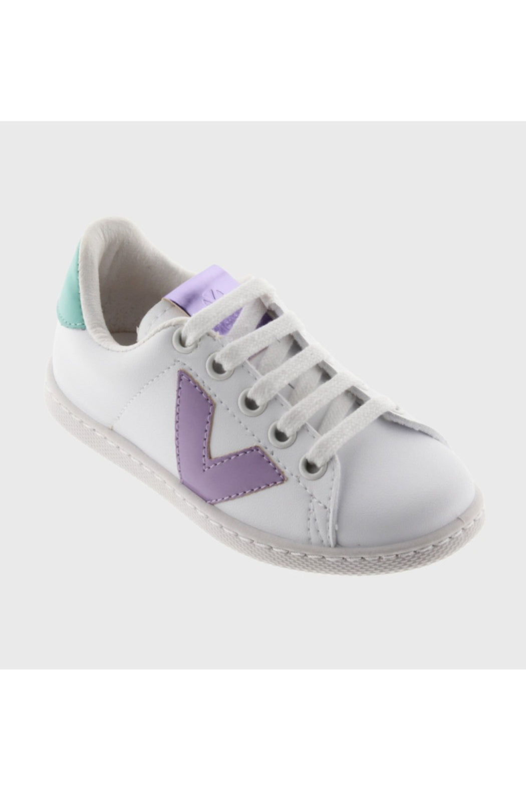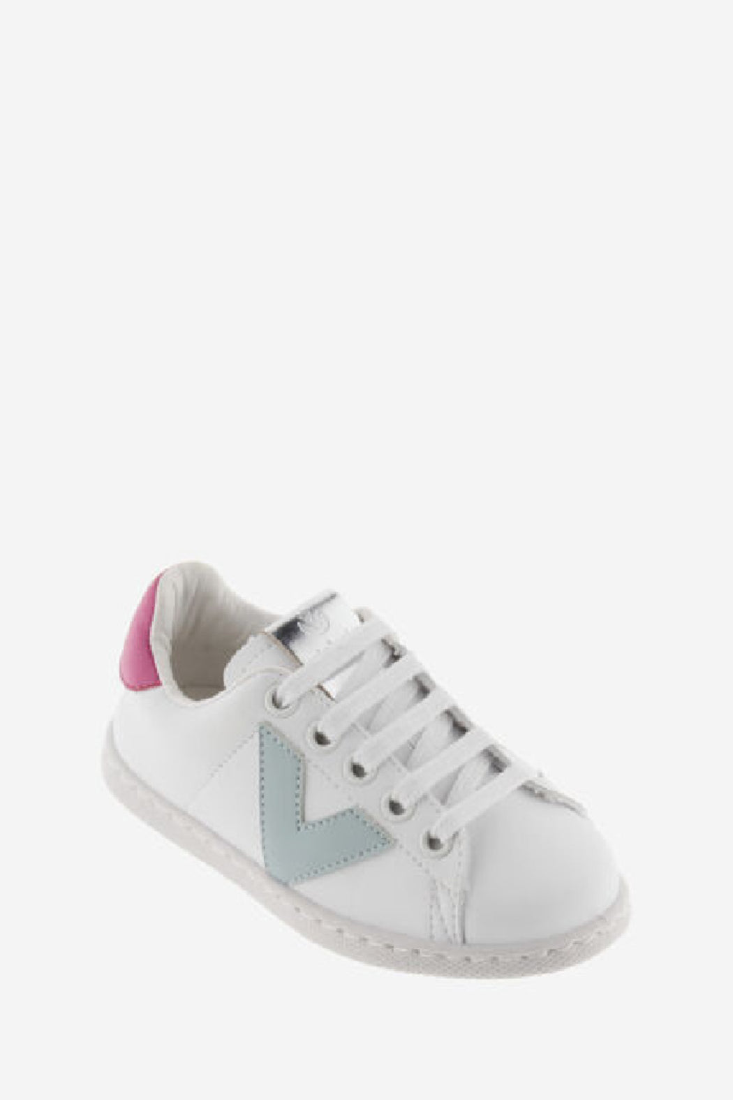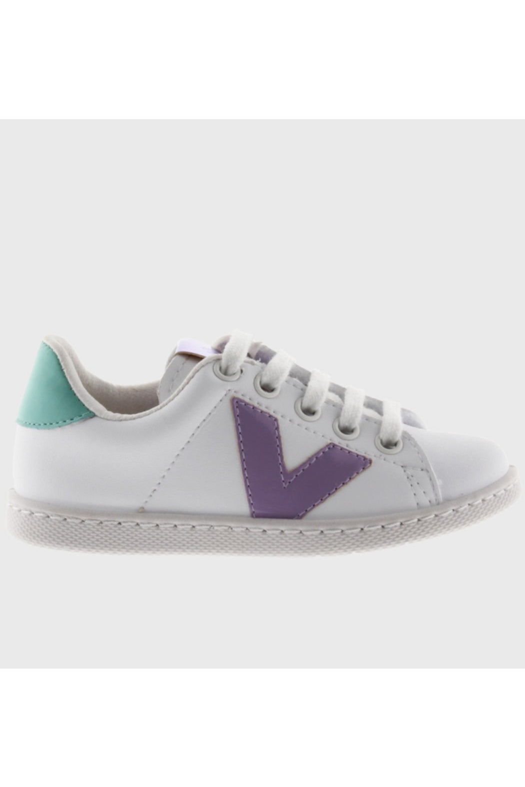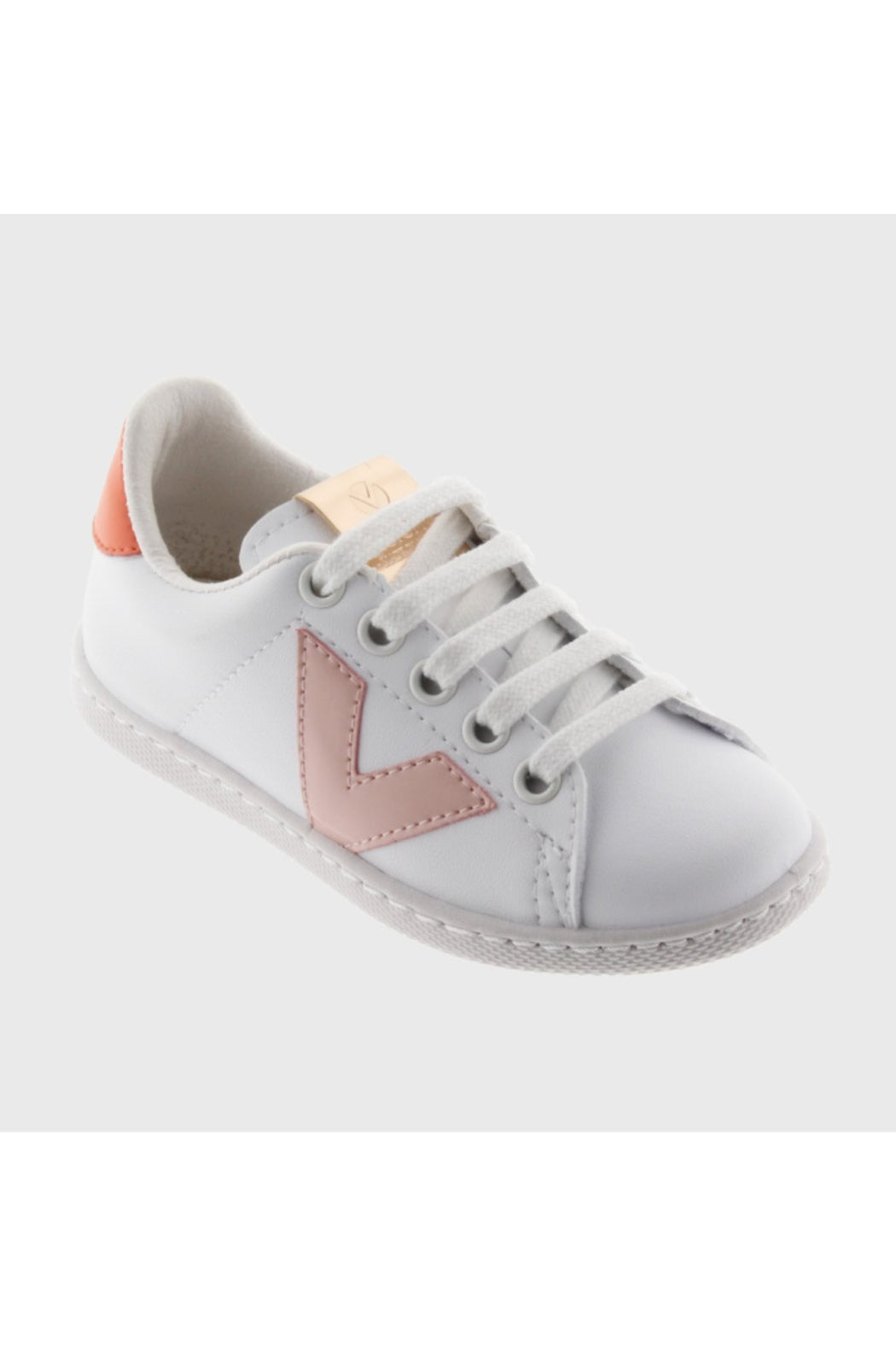 Children's trainers in leather effect material. White laces to match the sole and the upper. Victoria V on the side and pastel heel. Available from size 26 to 38.