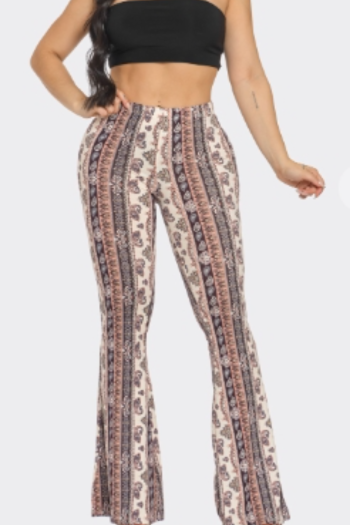 Multi-printed high waisted palazzo pants in a fitted style with an elastic waistband and flared hem. Super comfy style and fit in a super soft brushed fiber fabric. Sizes S-L. 95% Polyester; 5% Spandex. Hand wash cold and hang to dry. Imported.