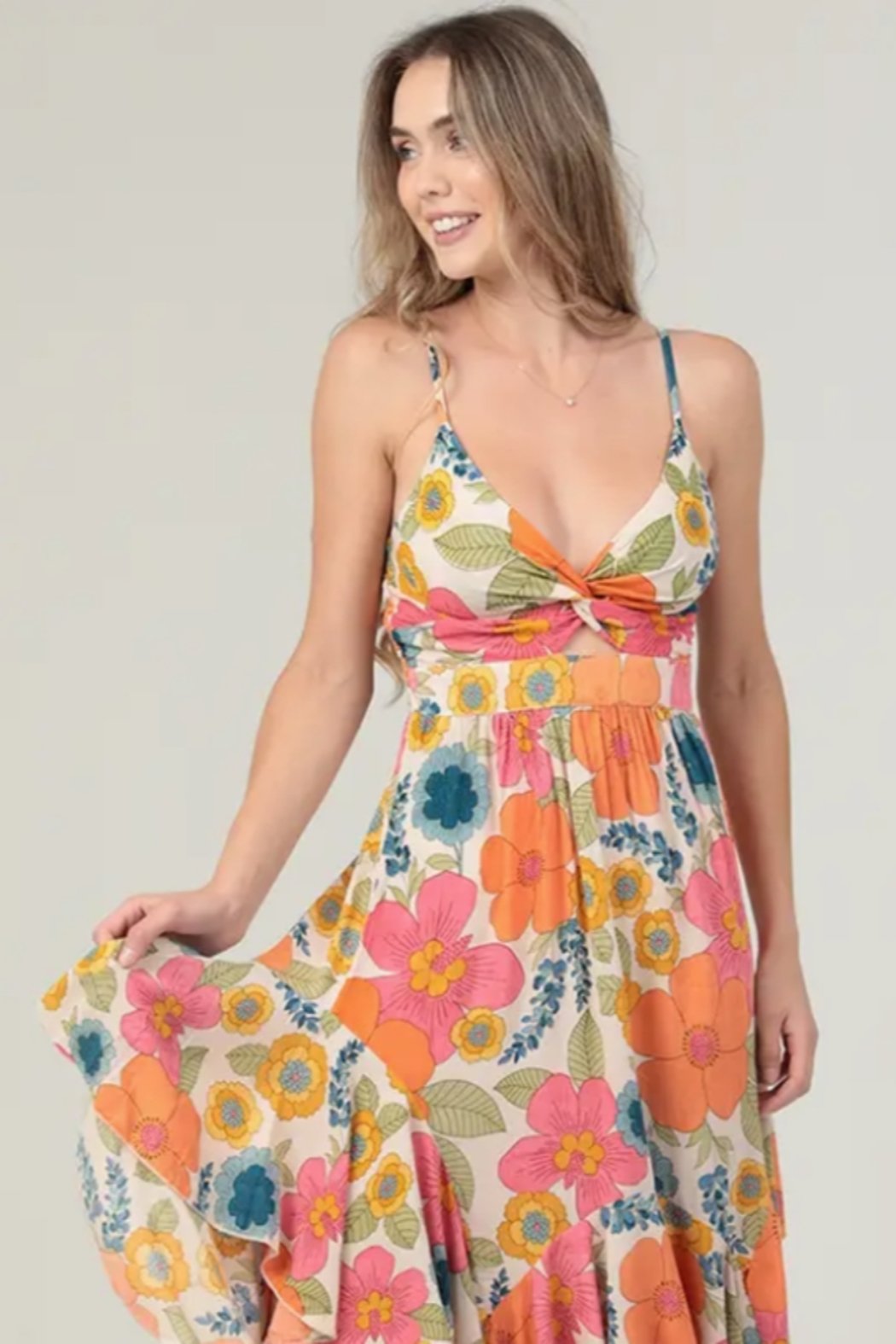 Boho Twist-Front Midi Dress with Flouncy Hem