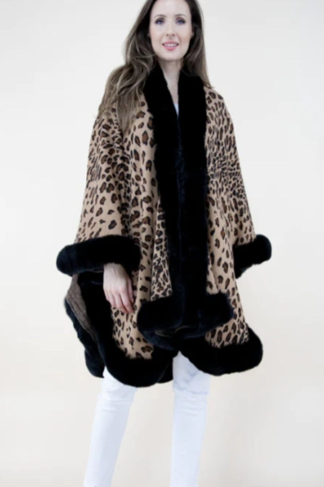 Beautiful Cheetah Print Cape in camel/brown, trimmed with black faux fur. Cozy warm and elegant. Front hook closure. 70% Acrylic; 30% Polyester.. Hand wash separately. Tumble dry low heat. Use cool iron on reverse, no iron on trim. Imported.