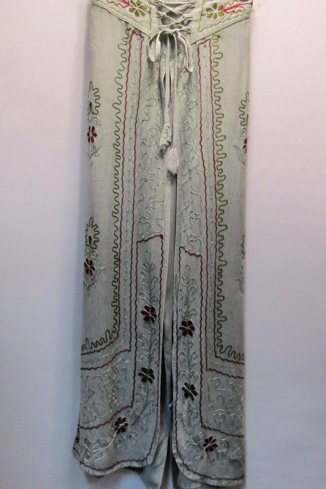 Ethnic inspired rayon wrap pant featuring front embroidery. Pant is pull-on style with a traditional wrap pant look.. Waistband has elastic in back and a front lace-up. 100% Rayon. Hand wash in cold water and hang to dry. Made in India. Small Medium Large X-Large Waist: 30"-34" 32"-36" 32"-38" 34"-39" Length: 38" 38" 38" 38" (waist to hem)