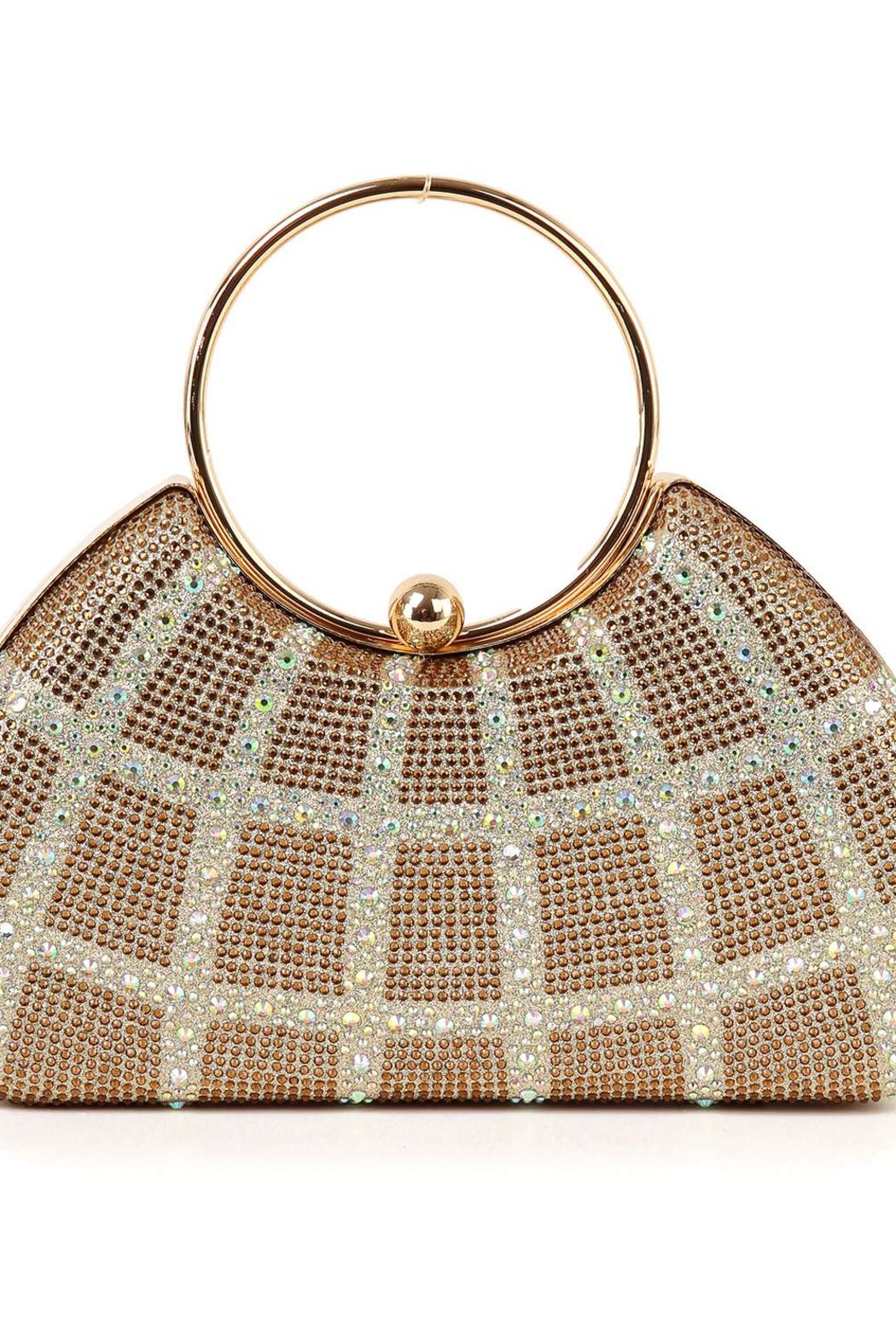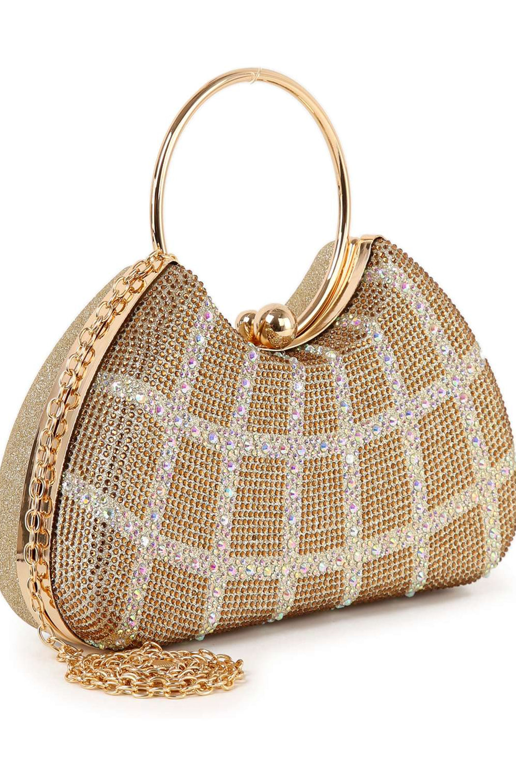 Dazzle by design. A sleek fusion of vintage elegance and modern flair, this evening bag stuns with a radiant grid of glittering stones that catch light—and attention—with every step. Thoughtfully sized for your essentials and finished with luxe gold accents, it’s the ultimate companion for nights that deserve to be remembered. 👜 Twin top handles (3.5" L) for a chic hand-carry ✨ 22" detachable gold-tone chain strap for versatile styling 🖤 Smooth faux leather exterior with soft black lined interior 🔐 Structured metal frame with secure top clasp closure 🌟 Polished gold-tone hardware for timeless glam 📏 Approx. Size: 9" L x 5" H x 2.5" W