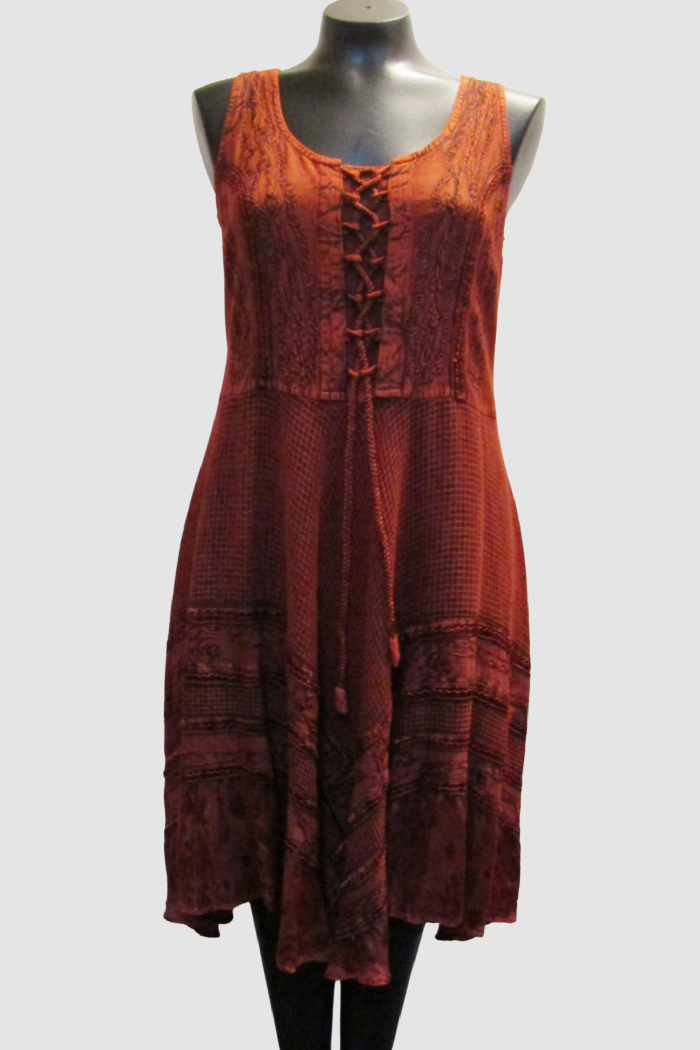 You'll be a standout in this beauty of a dress! An ultra-feminine silhouette features a fitted, lace-up bodice with embroidered detailing and an elasticized back panel with side ties for a comfortable fit. The extra full skirt is gorgeous with a texturey waffle weave fabric, embroidery, lace trims, and a flouncy hemline in a tone-on-tone floral print fabric. A beauty of a dress!