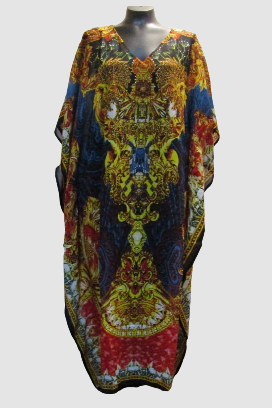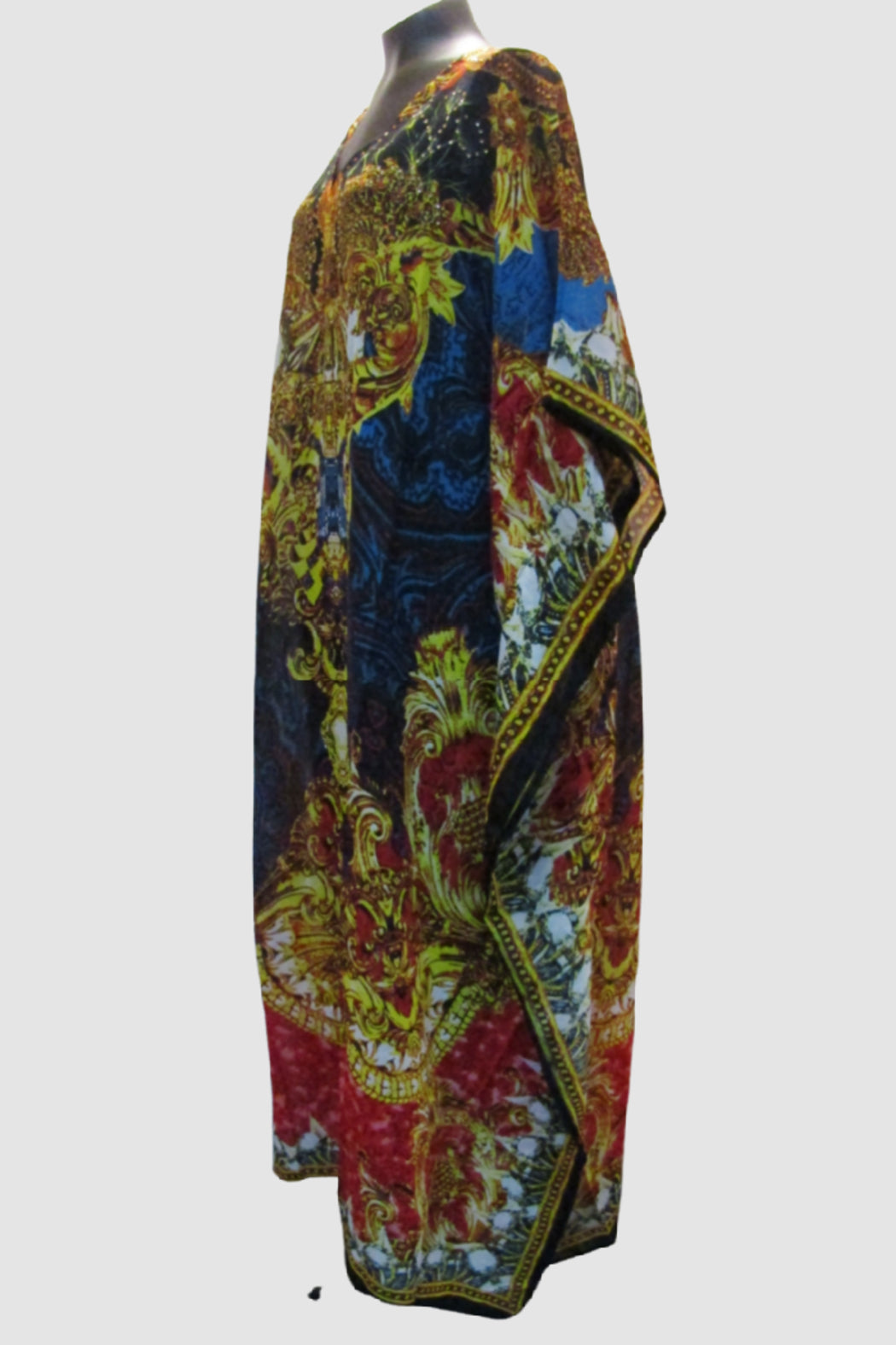 Long Beaded Kaftan in Opulent Blue/Gold Print