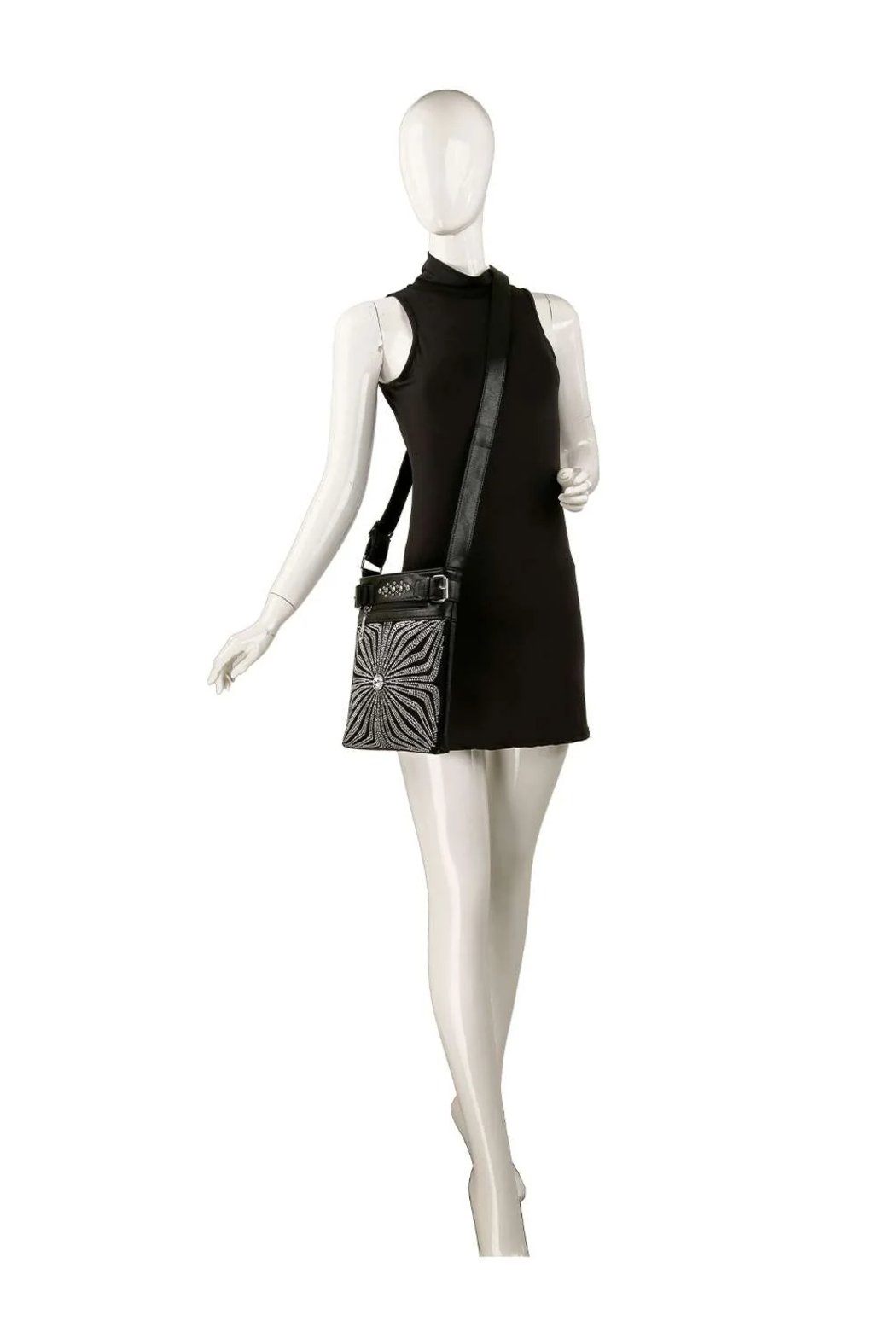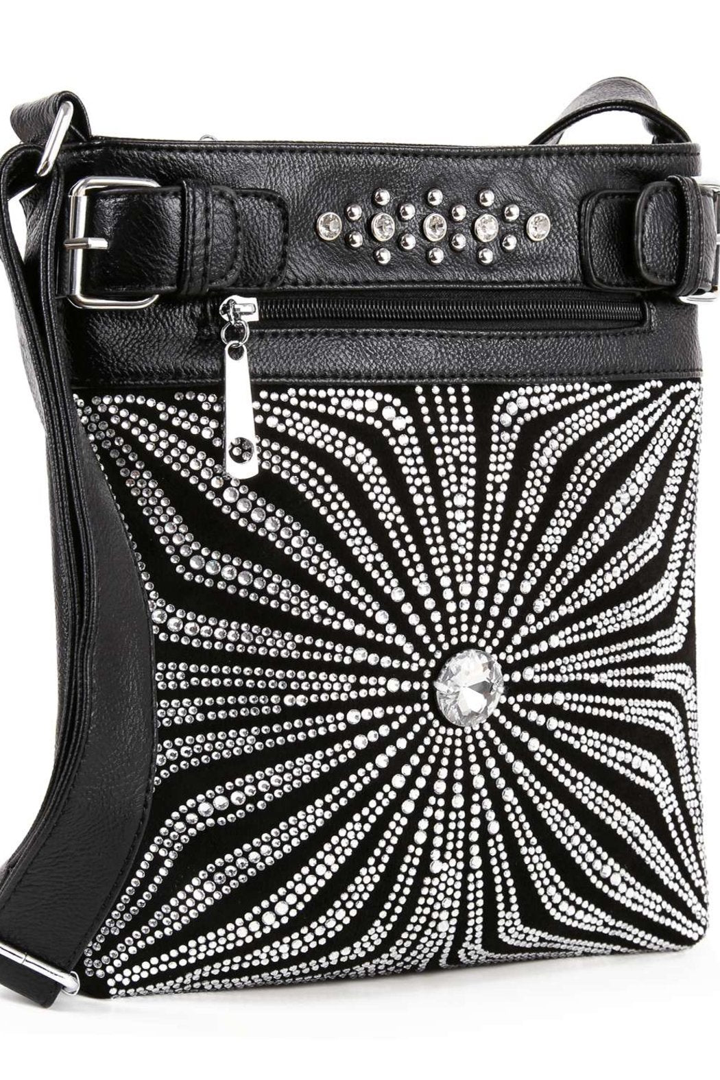 Make a statement with every step—this dazzling crossbody bag is adorned with radiant rhinestones arranged in an elegant, eye-catching pattern that sparkles from every angle. Designed to blend glam with function, it features multiple compartments to keep your essentials stylishly in check, all wrapped in soft faux leather with a sleek silhouette.