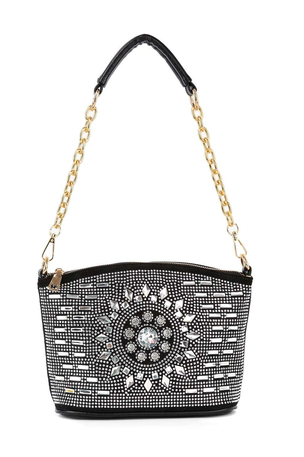 Make a bold entrance with this dazzling crossbody sling that refuses to blend in. The front shimmers with a radiant sunburst design—stones of varying shapes and sizes explode into a statement-making display that turns heads and sparks conversations. Designed for style and function, this compact bag features: * A sleek top zip closure for security * Gold-tone hardware for a luxe finish * A chain-accented shoulder strap plus a 22" detachable, adjustable strap for versatility * Handy back zip pocket for quick-access essentials * Spacious, lined interior with two slip pockets and one zip pocket to keep your belongings organized * Approximate size: 9.5”L x 6.5”H x 4”W Crafted from supple faux leather, this beauty combines edgy glamor with everyday practicality. Whether you’re headed to brunch or out on the town, this sling bag brings the drama ... in all the right ways.