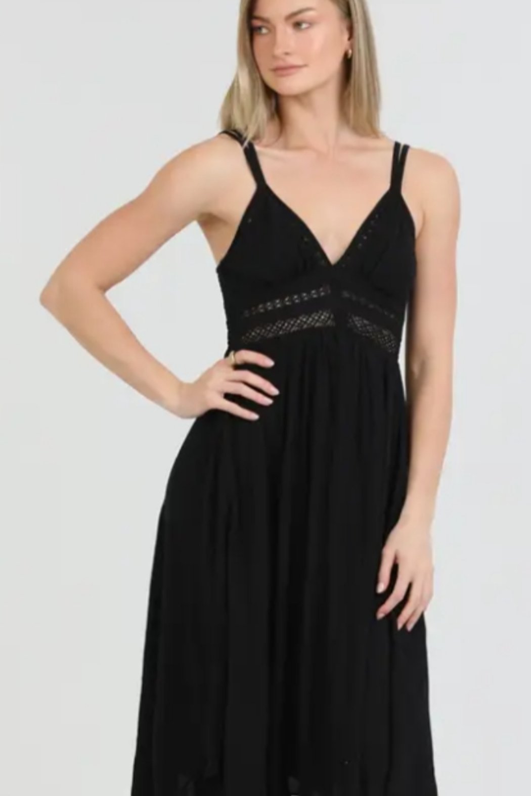 Meet your new go-to little black dress with a bohemian twist. Designed to flatter effortlessly, it features delicate lace detailing along the V-neckline and under the bust for a touch of romance. The flowing fit-and-flare silhouette is enhanced by a whimsical hanky hemline that moves with every step. Back smocking and double adjustable straps ensure a perfect, comfortable fit. Made in India from 100% lightweight rayon, this versatile piece blends everyday ease with boho-chic elegance—perfect for everything from casual outings to special nights out. * 100% Rayon * Hand was cold water and hang to dry