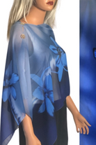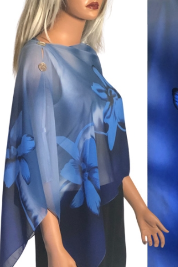 Two silky scarves attached with six buttons so that it can be worn as a shawl, as a vest, or as a big scarf. This silky poly fabric feels just like silk. but without the fussy care. Depending on the top you wear underneath, this poncho is all seasons appropriate * Two Silky Feel Polyester Scarves , each measuring 20"x60" * Secured together with 6 buttons, 3 on each side of neck opening * Imported
