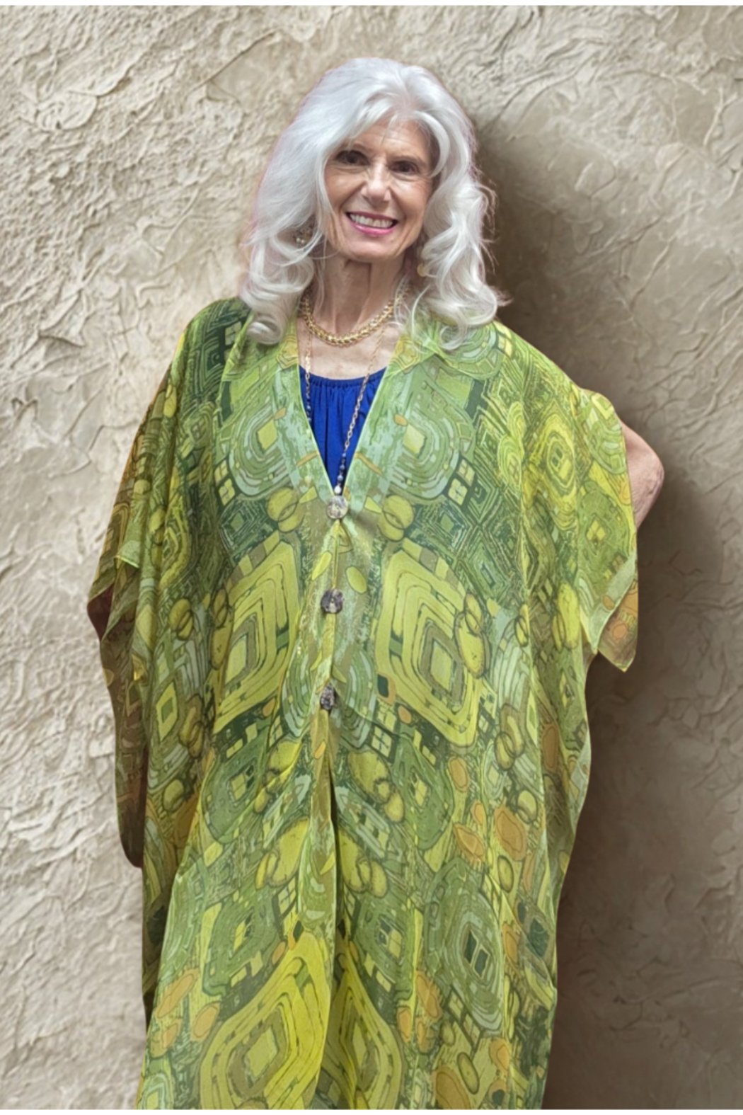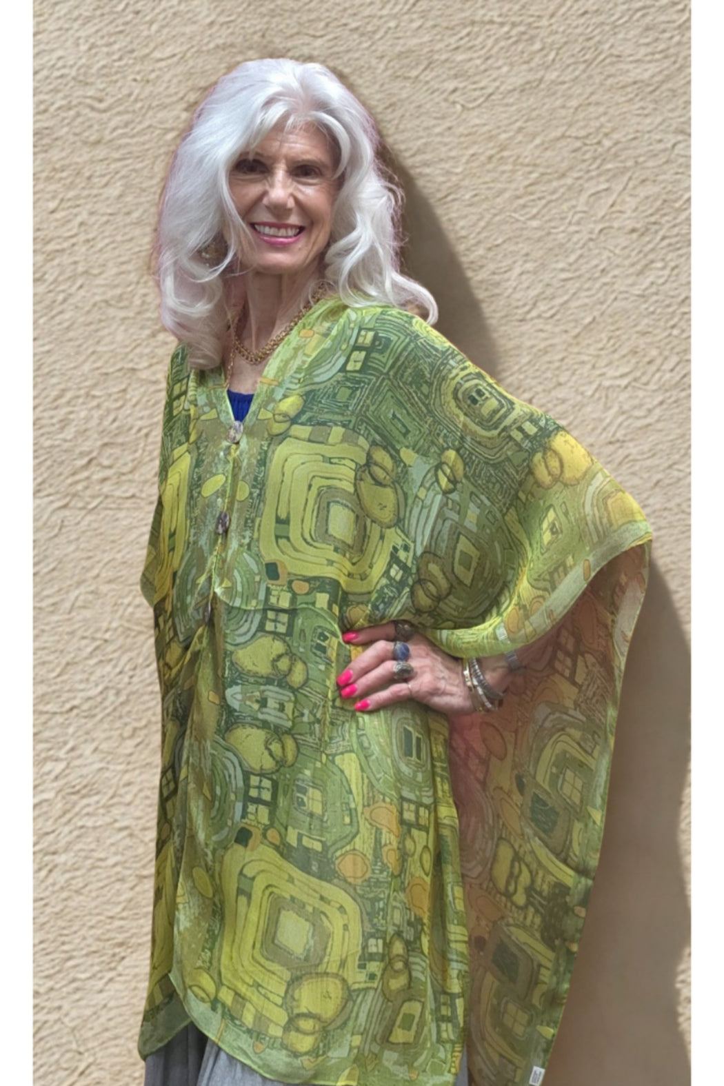 Silky Sheer 6-Button Poncho - Lime Abstract