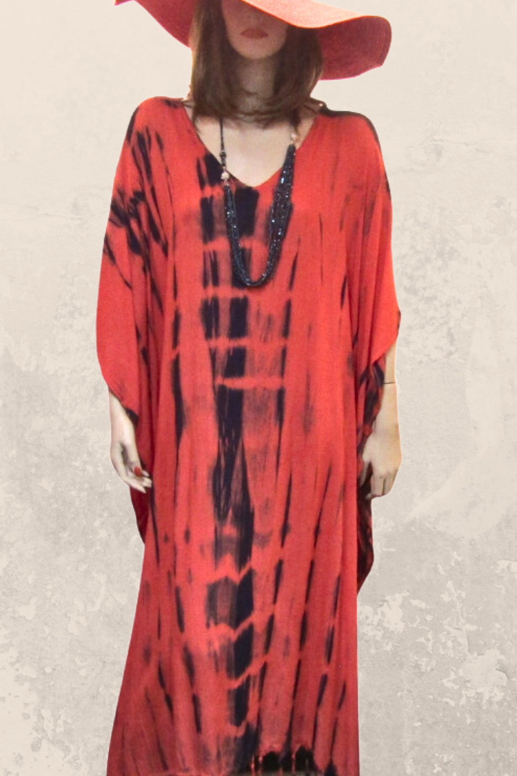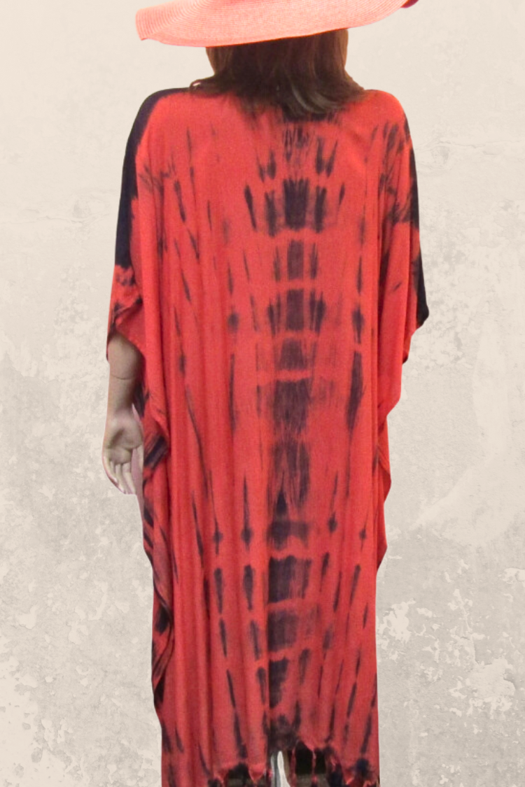 Beautiful easy wear kaftan available in different tie dye combinations. V-Neck; hemline fringed tassels. 6" side seam. Armhole measures 12" top to bottom. Bottom side slit on each side is 26" high. Kaftan is a large square measuring 44" wide and 48 in length. 100% Rayon. Hand wash in cold water; hang to dry. Imported.