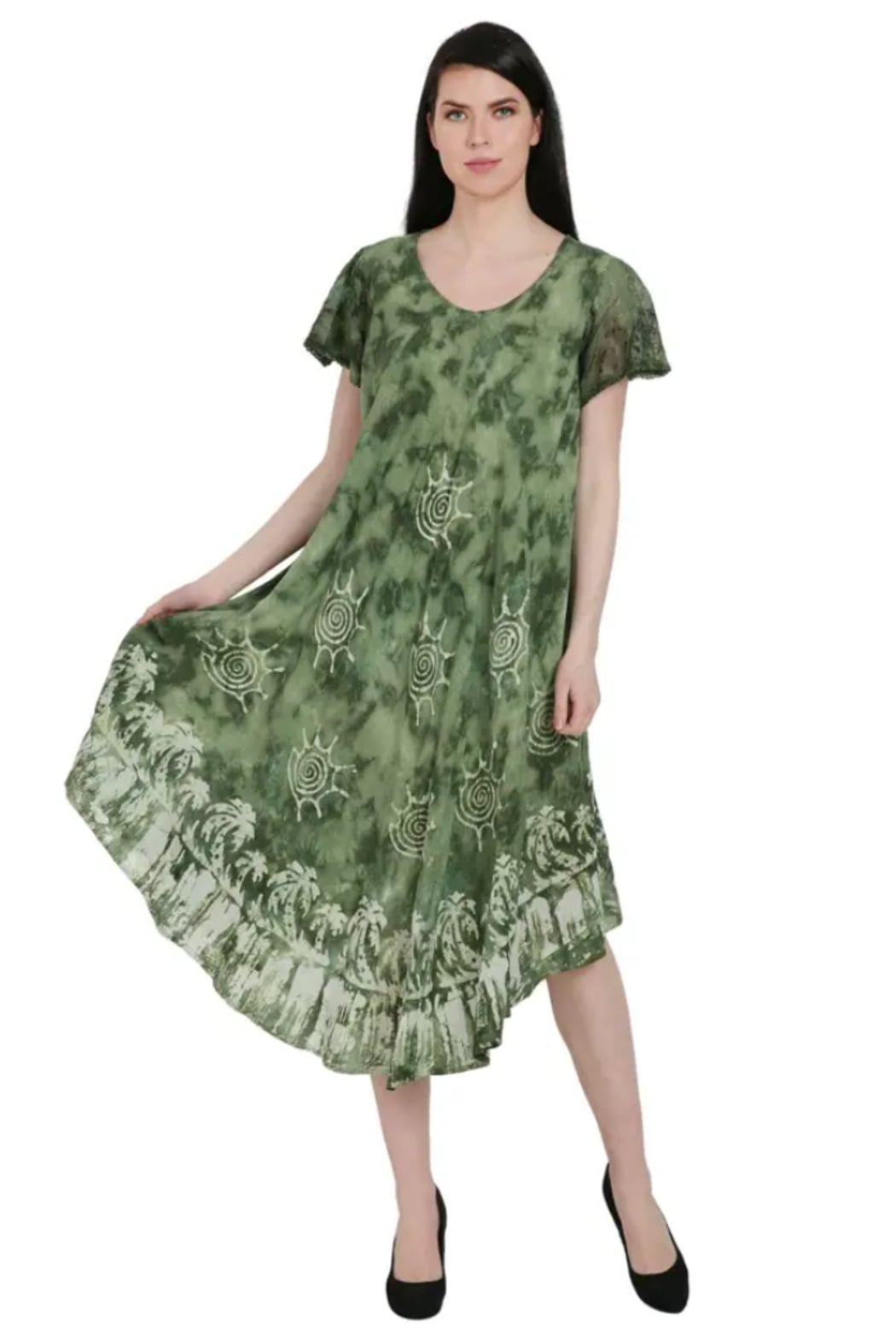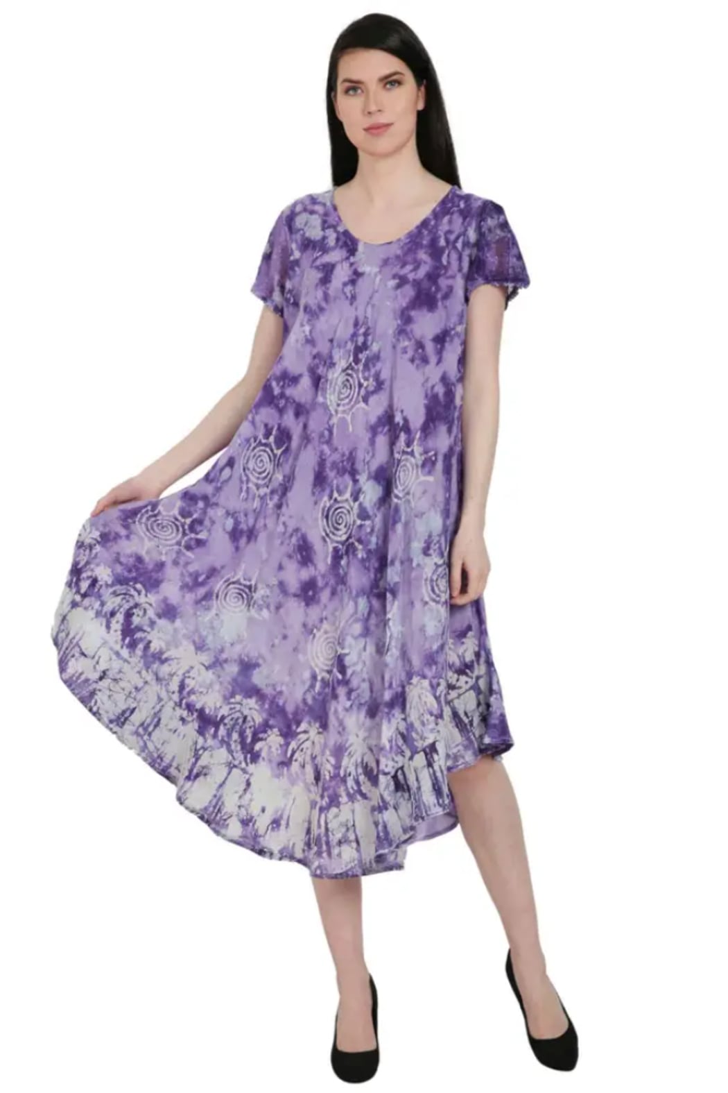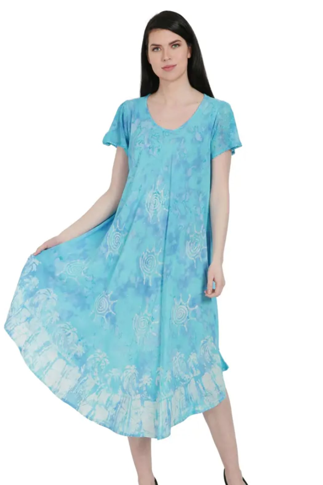 Short-sleeve bias-cut dress with a scooped neck and eyelet trim accents. The serene two-tone tie-dyed background is accentuated by block print inspired palm trees at the border and suns throughout. The perfect combination of comfort, style, and function. The silhouette of the dress allows for a loose and flowy fit that's flattering on almost any body type (regular or plus ). The breathable rayon fabric makes it perfect for hot summer days and versatile enough to be worn out and about or just around your home. Length measures approximately 45" from back neckline to longest point of hemline.