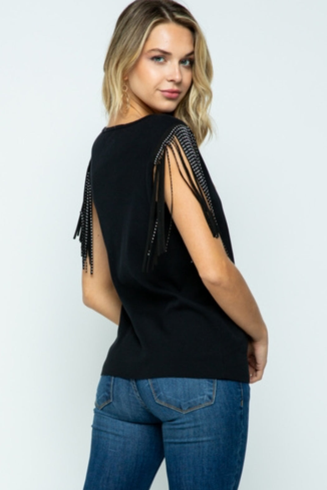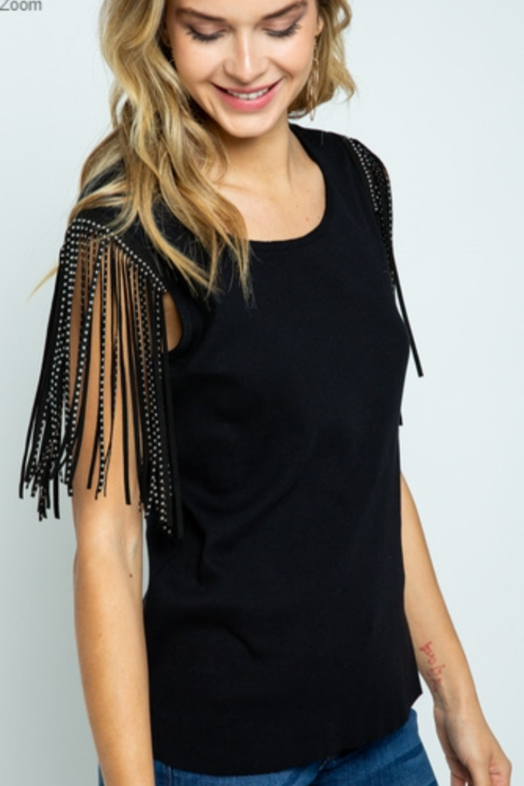 You will make a statement in this striking top with silver studded shoulder fringes. Soft & stretchy cotton. Dry clean or hand wash. Made in USA. Sizes S-XL