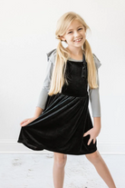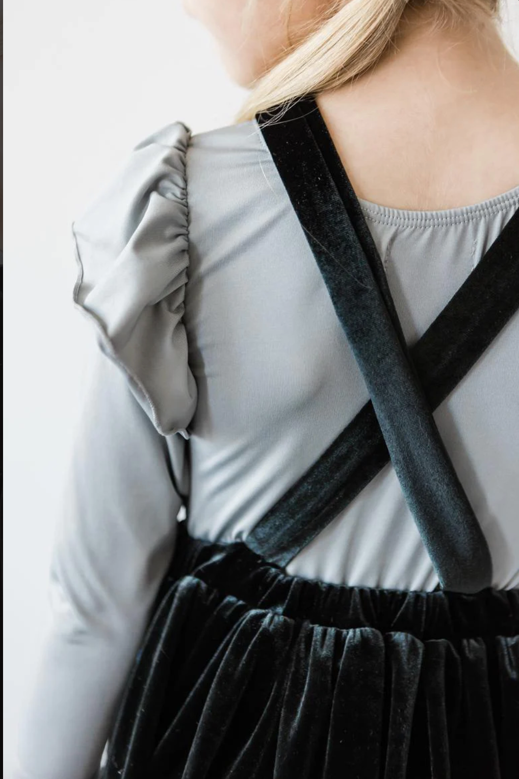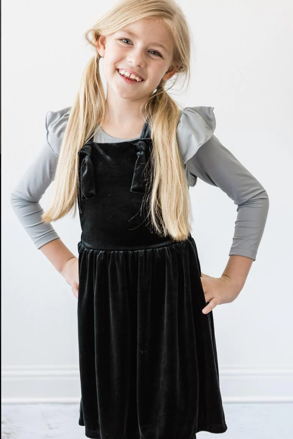 Our velvet pinafore is super soft and adjustable for the perfect fit! Wear straps straight or criss crossed in the back. Super cute with our flutter sleeve tees. We also love pairing over a twirl dress, so the dress peeks out the bottom! True to size, but if your little one is between sizes or tall; we suggest ordering one size up. Solf Stretchy Fabric Machine Wash, Tumble Dry