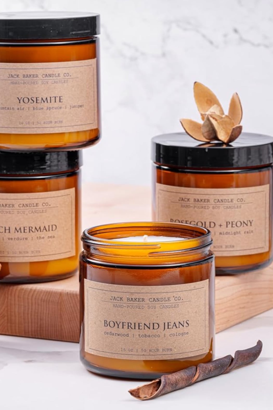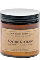 An apothecary-style soy candle presented in an amber glass jar with a black lid. The Boyfriend Jeans - Apothecary Candle features woody scent notes of cedarwood, tobacco and cologne for a warm, masculine aroma. Hand-poured soy wax offers a clean burn and the label indicates approximately 50 hours of burn time. This candle is made by Jack Baker Candle Co. and suits countertop displays or cozy living spaces.