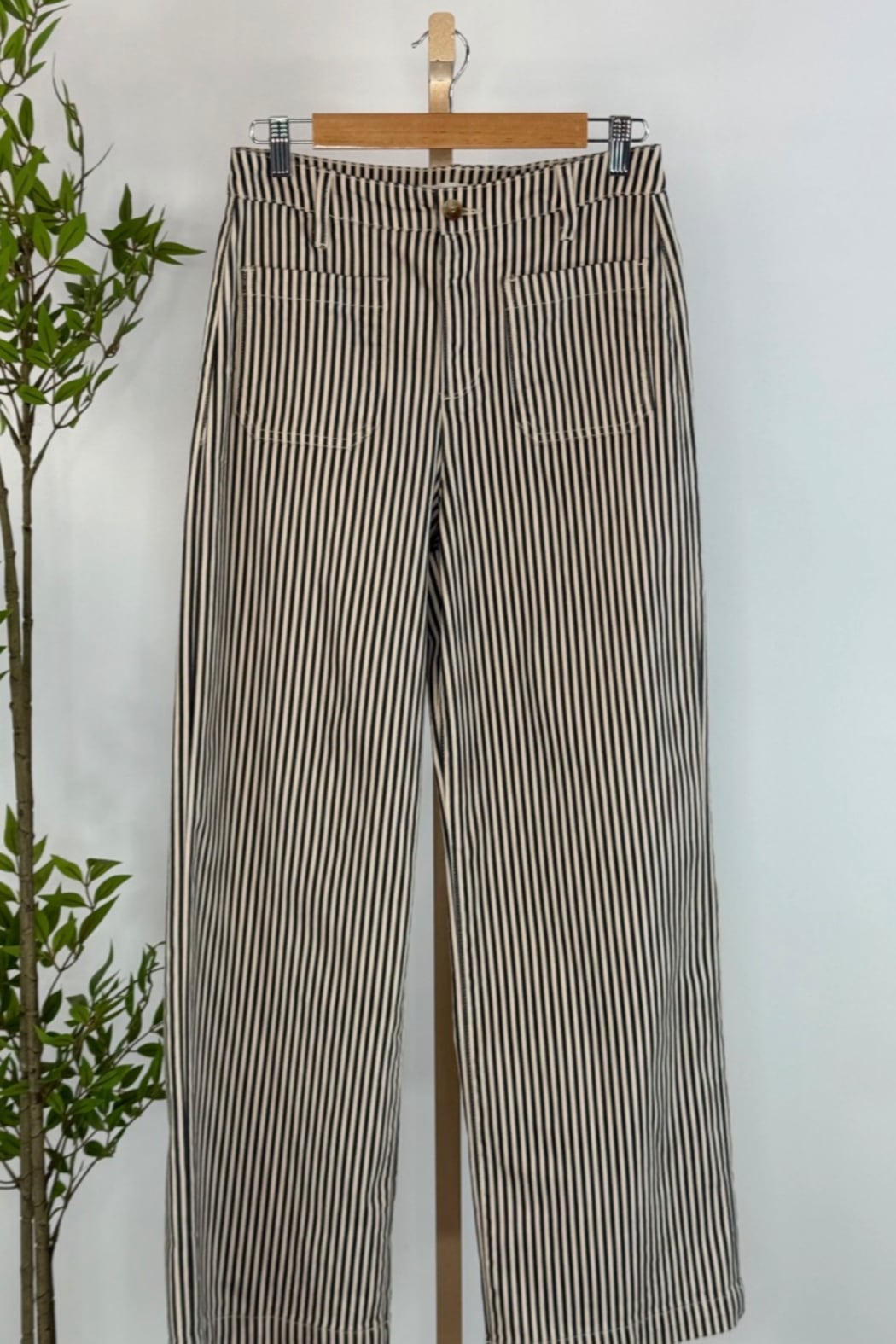 Introducing Another Love, Bristol High-Rise Wide Leg Pant, crafted to bring comfort and versatility to your wardrobe in a fun cream and black stripe. Designed with a wide-leg silhouette, these pants feature practical patch pockets and a flattering high-rise waist, complemented by a button closure. Pair with a tee and a denim jacket for a casual look or dress them up with a black sweater and ankle boots.