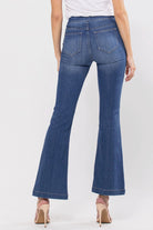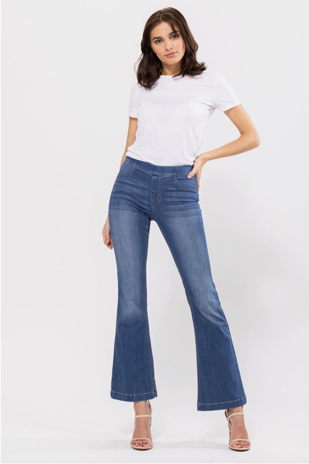 These ultra-stretchy jeans guarantee comfort! The medium wash flared jegging features a flattering flared fit, a faded wash, and light whisker detail. Additionally, it has two faux front pockets and two back real pockets.