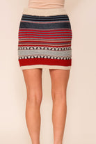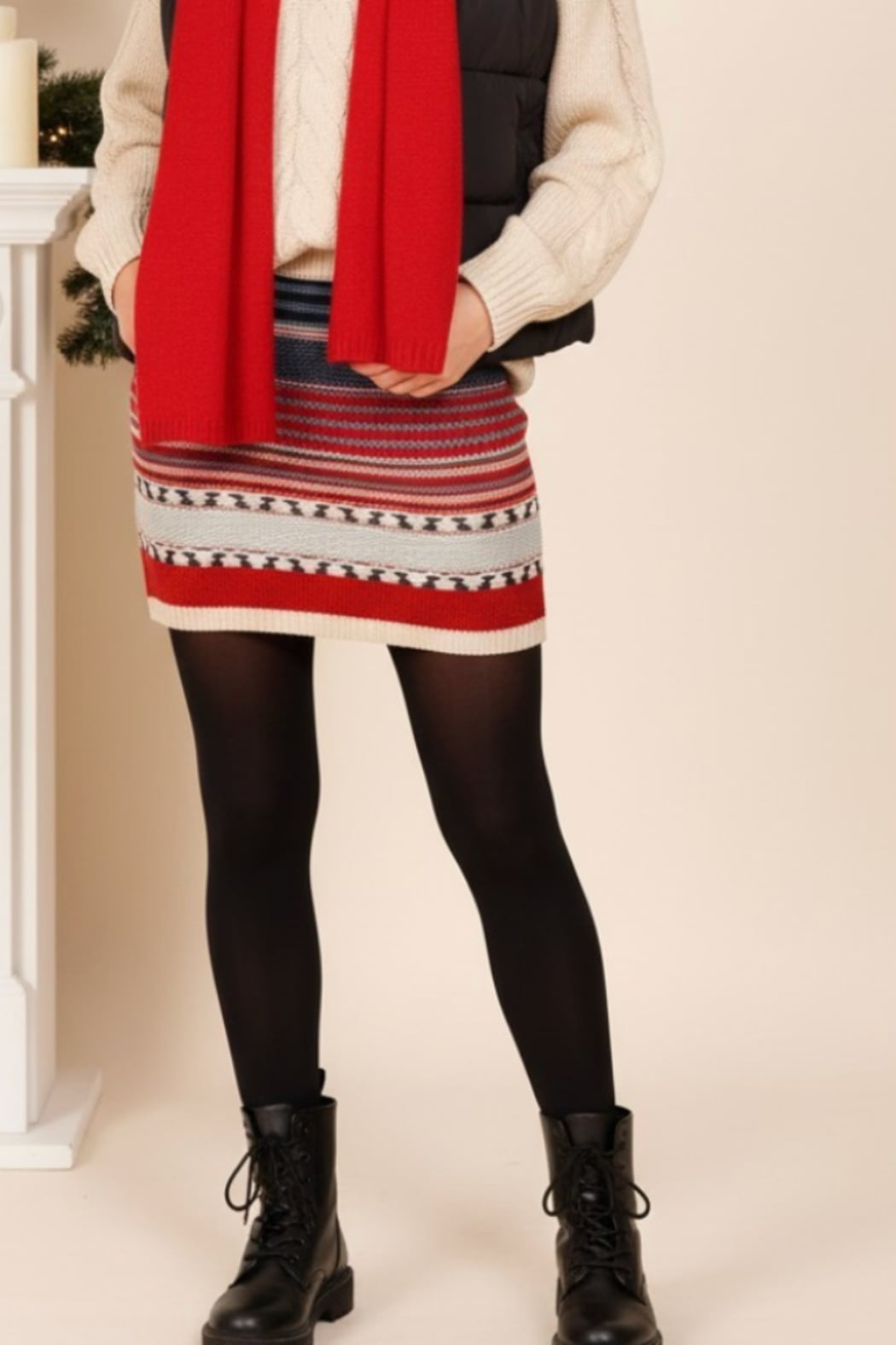 A festive figure-skimming mini with a knitted Fair Isle motif perfect for holiday gatherings. The Christmas Caroling Mini Skirt by Timing is crafted in sweater-knit fabric with a fitted pencil silhouette that sits at mid-thigh. Pair it with tights and boots for cozy seasonal styling or dress it up for evening parties. The striped pattern and warm color blocking give it a playful, preppy-meets-trendy vibe.